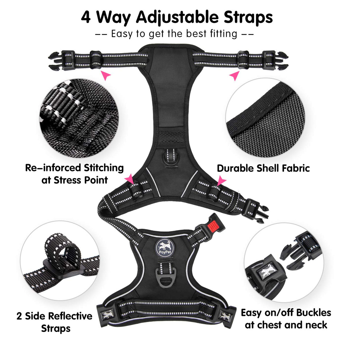 Poypet Dog Harness No Pull, Reflective Vest Harness With Front & Back 2 Clips And Easy Control Handle For Small Medium Large Dog