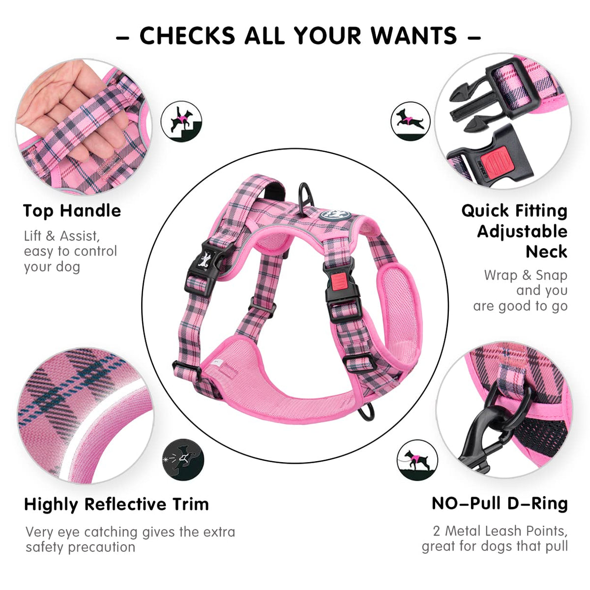 EASY TO GET ON/OFF: This no pull harness has the snap buckle in for both the body and neck so it makes it so much easier to put on and off. NO need fight dog's head to slip in the harness won