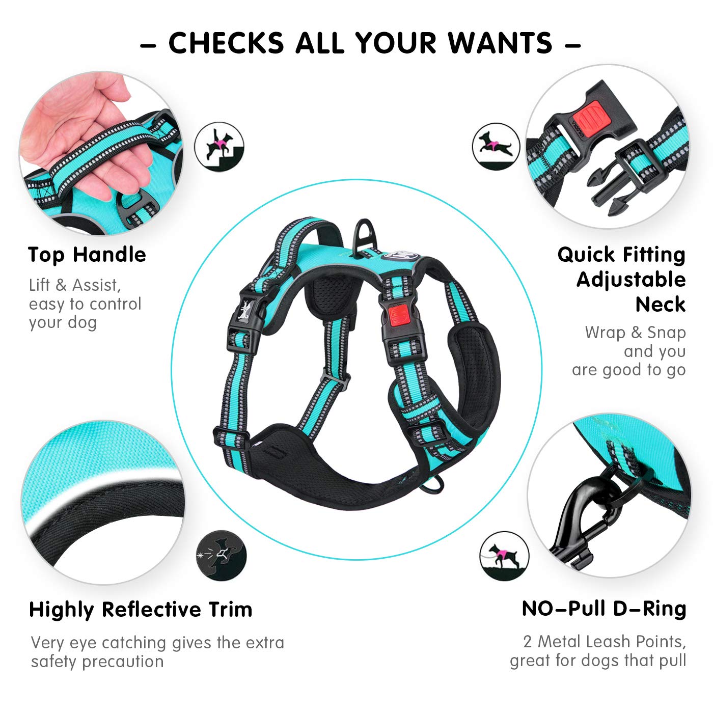 Poypet Comfortable No Pull Safety Dog Harness - Simple To Adjust, Highly Reflective And Nicely Padded. --> Easy Walk. --> Easy To Clean. --> All Weather Use. --> Innovative No-Choke Design. --> 2 Durable Metal D-Rings On Top And Bottom. --> Light Weight But Tough Enough. --> Padded Handle For Extra Control To Guide Your Dog. --> Reinforce Stitching At Stress Points For Added Durability. --> Reflective Straps Allows Safe At Night Or Early Morning Walk. --> Quick Dry And Breathable Mesh Fabric Lining, Skin-Friendly, Soft, Comfortable And Well Made. Size: X-Small -- Neck: 10-12.5 ; Chest: 10-22 ; Small --- Neck: 12-18 ; Chest: 14-24 ; Medium -- Neck: 14-20 ; Chest: 16-28 ; Large --- Neck: 16-24 ; Chest: 22-33 ; Extra Large - Neck: 22-33 ; Chest: 22-44 ; Order The Harness For Your Furry Friends Today, And Have An Enjoyable, Worry-Free Walk!