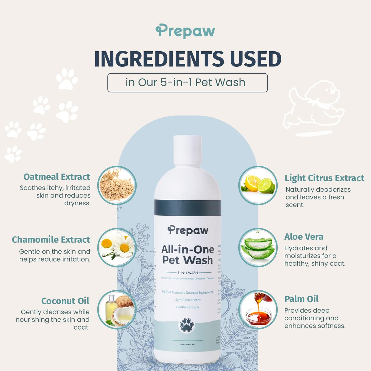 Prepaw 5-In-1 Pet Wash, A Revolutionary Grooming Solution Designed To Clean, Condition, Moisturize, Deodorize, And Detangle Your Pets Coat-All In One Bottle. With A Light Citrus Scent, This Eco-Friendly Product Eliminates The Need For Multiple Grooming Products And Leaves Your Pet Feeling Fresh And Healthy. Unlike Traditional Pet Shampoos, Our Formula Features 98.25% Natural Ingredients Derived From Plants, Such As Coconut And Aloe. This Gentle Yet Effective Wash Thoroughly Cleanses Your Pets Coat While Replenishing And Locking In Moisture To Keep Their Skin Hydrated. Perfect For Pets With Sensitive Skin, Our Dye-Free, Sulfate-Free, And Paraben-Free Wash Ensures A Safe And Irritation-Free Grooming Experience. Key Features: Gentle Plant-Based Formula Ideal For Sensitive Skin Deep Cleans While Leaving The Coat Soft And Manageable Moisturizes And Hydrates To Promote Skin Health Light Citrus Fragrance For A Refreshing Finish Quick-Rinse Formula Saves Time During Baths Our Innovative Pet Wash Stands Apart From Standard Shampoos That Often Rely On Harsh Synthetics And Minimal Natural Ingredients. By Choosing Our Product, Youre Opting For A Safe And Effective Wash That Prioritizes Your Pets Health And Well-Being. Ingredients: Water, Plant-Based Surfactants Derived From Coconut And Palm, Fragrance, Preservative, Oatmeal, And Aloe Extract. Usage Directions: Wet Your Pets Coat Thoroughly. Apply A Generous Amount Of The Product And Work Into A Rich, Creamy Lather For A Few Minutes. Rinse Immediately For A Clean, Soft, And Tangle-Free Coat.