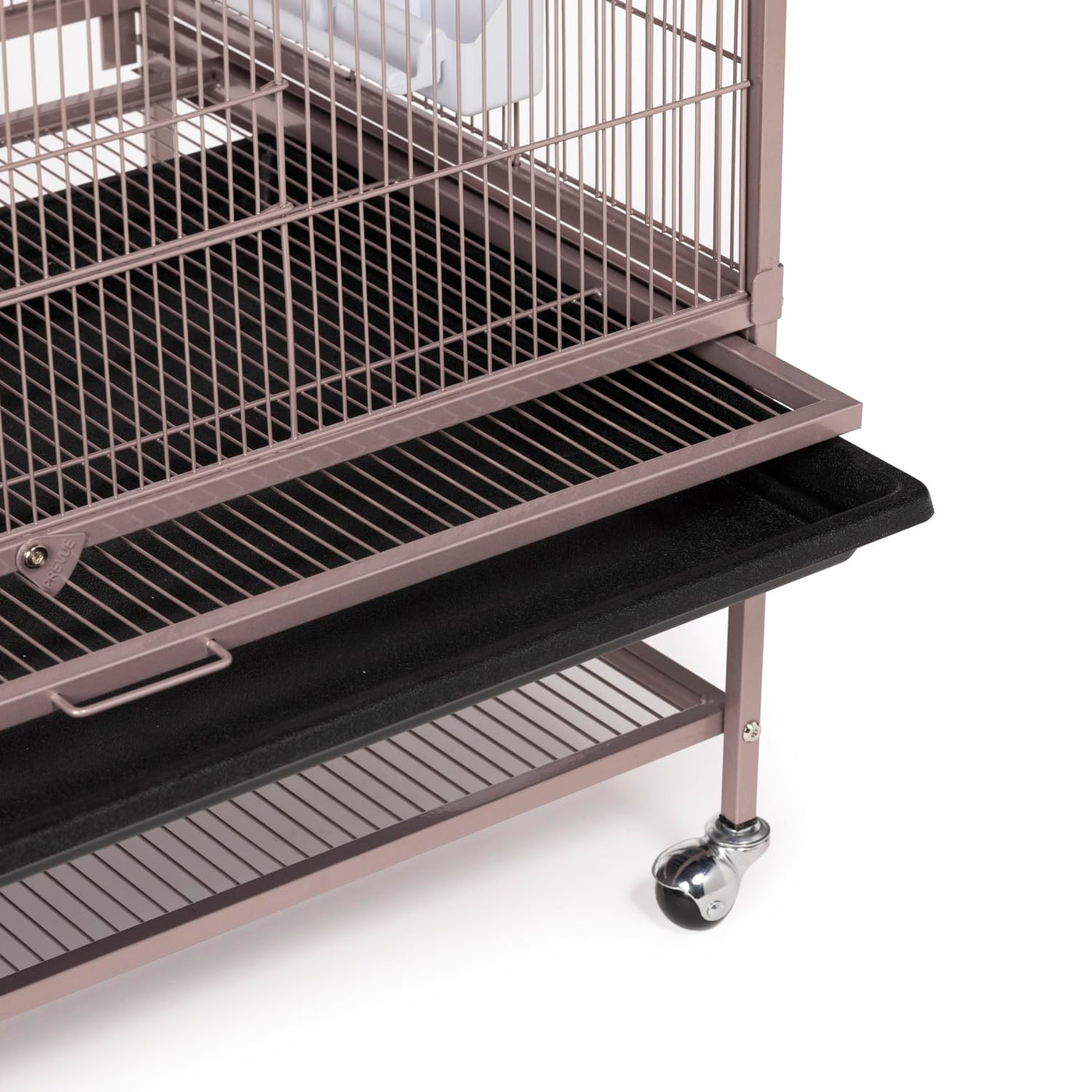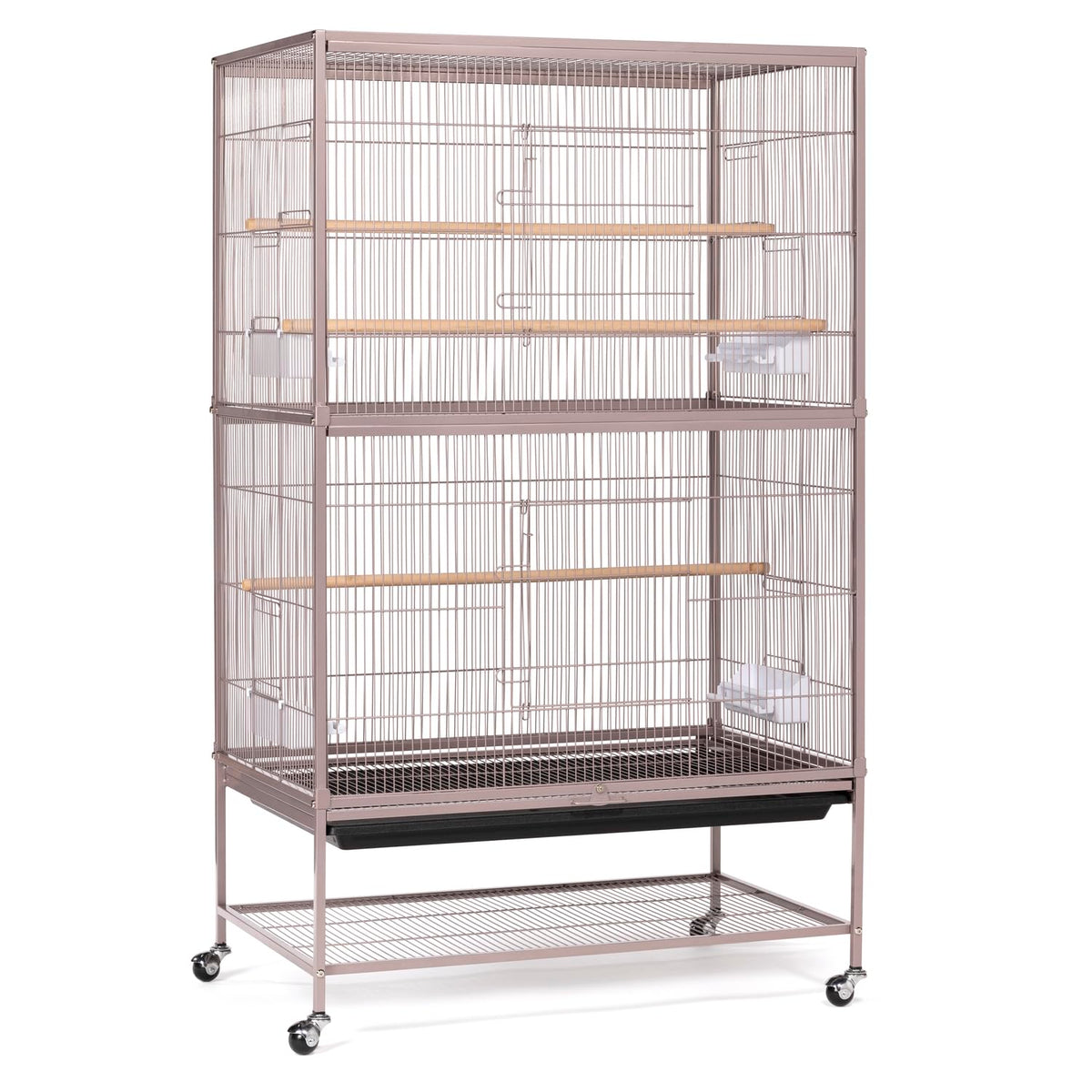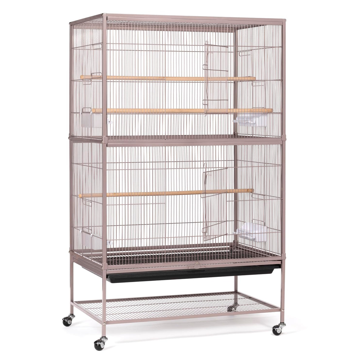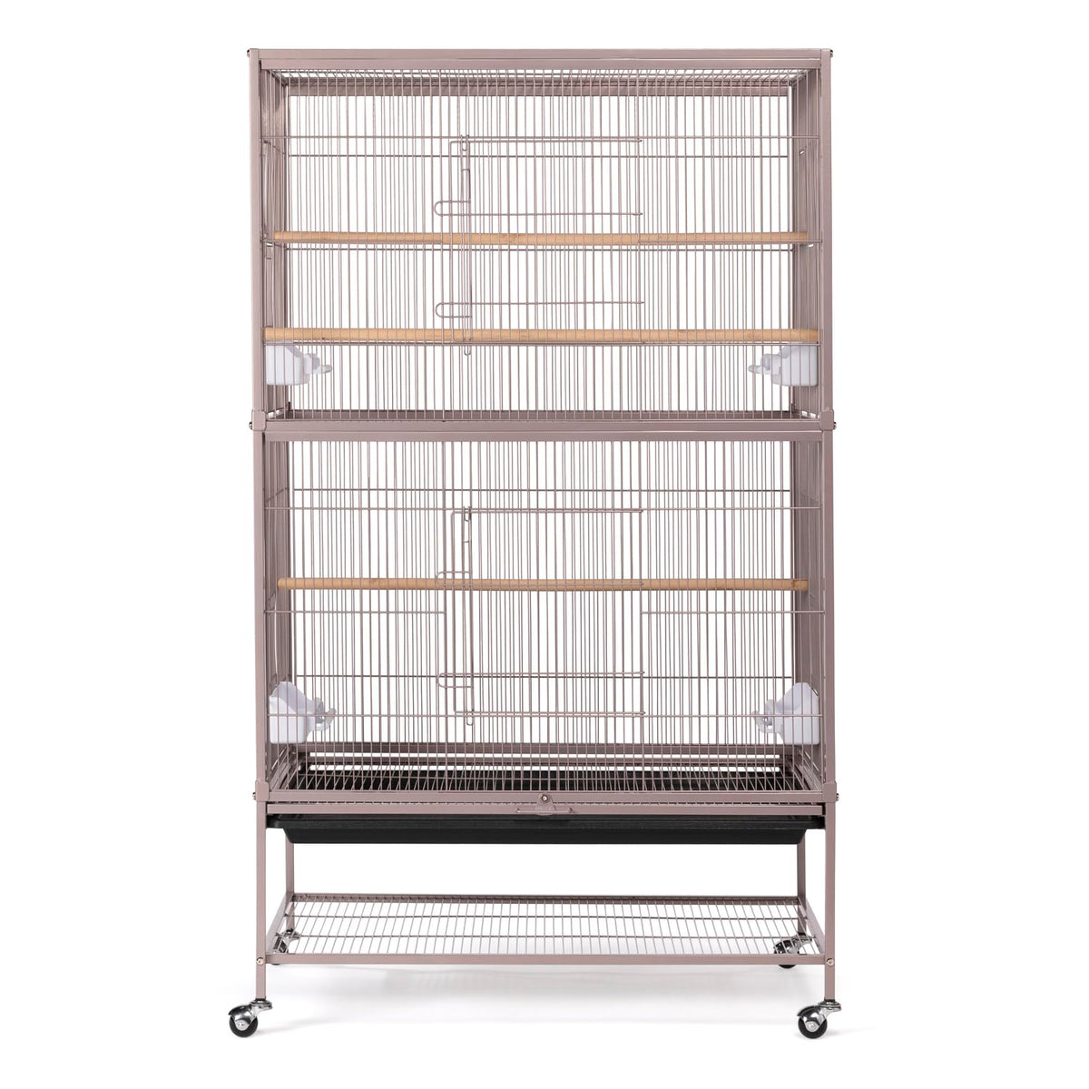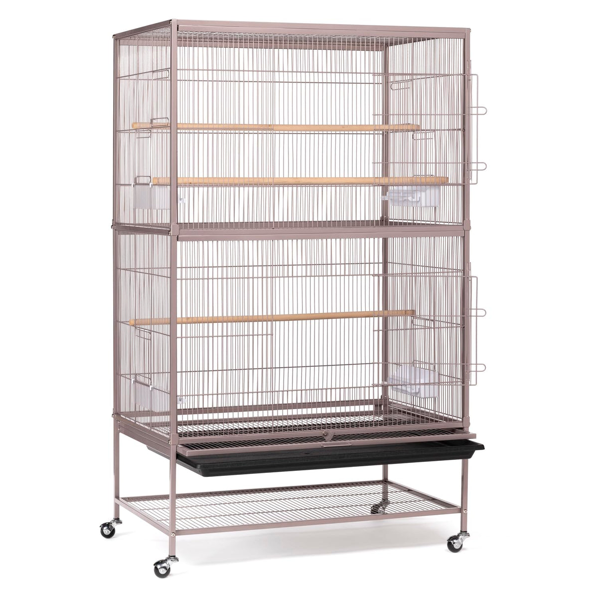 Prevue Pet Products powder-coated steel construction Flight Cage with Stand F042 Blush Bird Cage makes the perfect home for multiple parakeets, canaries or Finches. Featuring two large front doors and a bottom shelf for additional storage space, this flight cage stands on rolling casters and is easily moved from room to room. Four plastic double cups and three wood perches are included in this economical extra-large cage. Our powder-coated steel construction Flight Cage with Stand is 31 long, 20-1/2 wide and 53 high with 1/2 wire spacing, available in Blush powder-coated steel construction only.
