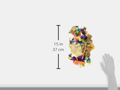 Prevue pet products bodacious bites tough puff bird toy 62375 will provide hours of foot and beak exercise as birds climb, swing and gnaw on a variety of shapes and textures. made from solid hardwood strung together with cotton rope or leather strips, bodacious bites bird toys may also include leather shapes, plastic beads, sea shells and frayed ropes. all materials are 100-percent safe, non-toxic fdandc colors and connect easily to cage with quick-link attachments. toy is hand made and actual measurements may vary slightly. as always, supervise birds at play. our bodacious bites tough puff bird toy is approximately 14-inch long and 7-inch wide, ideal for medium to large birds.