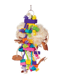 Q: What materials are used in the Bodacious Bites bird toy?A: This bird toy is made from solid hardwood, rubber wood branches, sisal fiber, banana stem rope, colored sisal rope, coconut shell, leather shapes, plastic beads, and sea shells. All materials are 100-percent safe and non-toxic for birds.