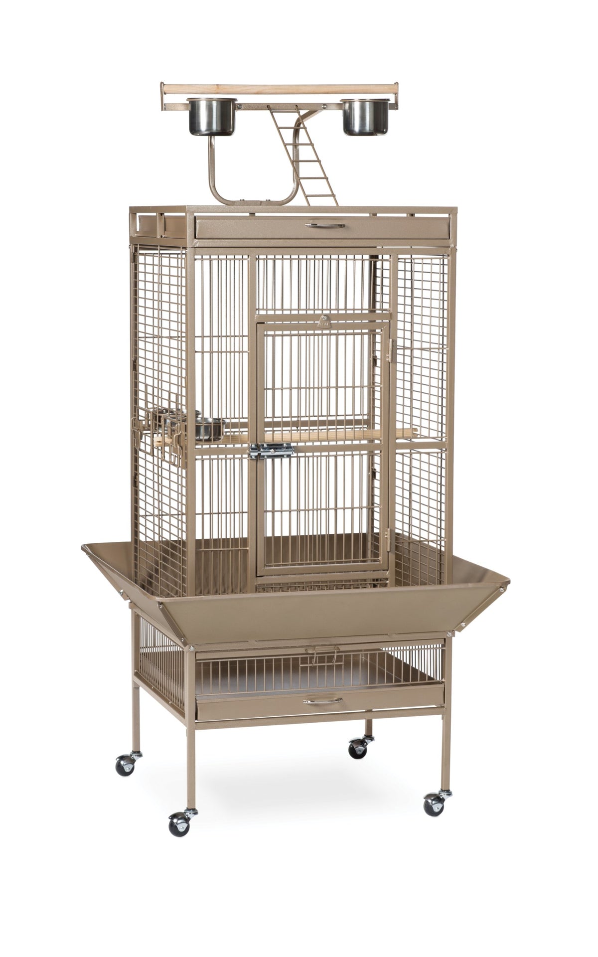 Prevue Pet Products Wrought Iron Select Cage in Coco Brown offers quality craftsmanship at an affordable cost. Constructed of wrought iron with a cagetop playstand to keep your bird entertained and content, the heavy-duty push button lock keeps your bird securely inside its cage when playtime is over. This select bird cage also includes four stainless steel cups, two wood perches and a castered stand for portability. Both drawers and bottom grille are removable for ease of cleaning while the rounded corner seed guards control mess around the cage. Our Wrought Iron Select Cage in Coco Brown has 3/4-inch wire spacing and measures 24-inch long, 20-inch wide, 60-inch high without the seed guard. Exterior cage measurements with seed guard are 32-1/8-inch long, 28-1/8-inch wide, 60-inch high. Interior cage measurements are 23-1/2-inch long, 19-1/2-inch wide, 34-3/4-inch high. Height without playtop: 53.62" H
