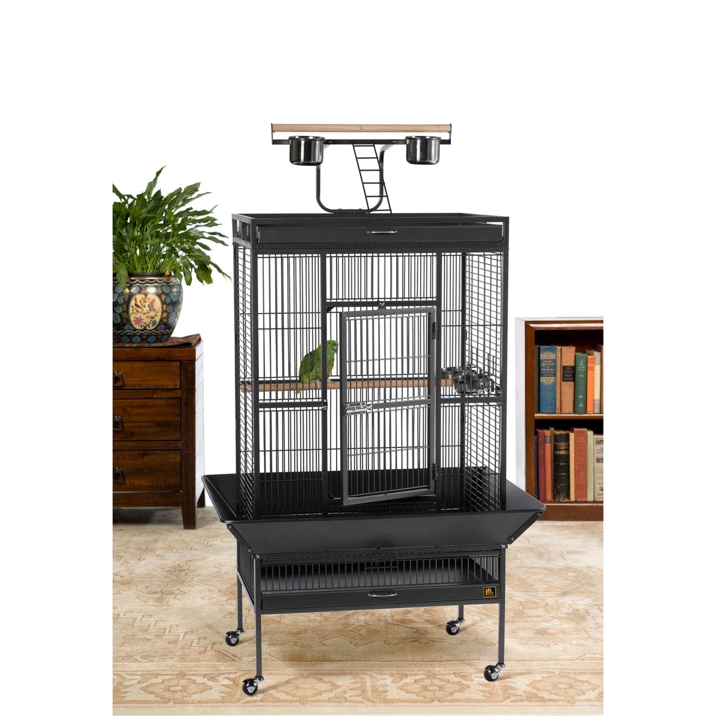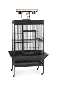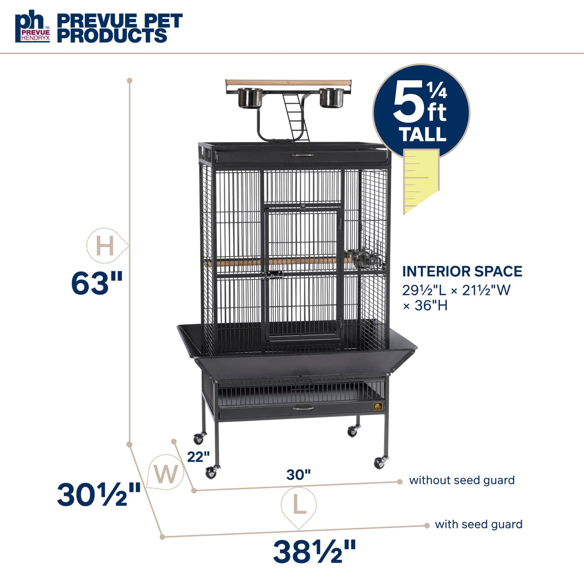 Prevue Pet Products Wrought Iron Select Cage In Black Hammertone Offers Quality Craftsmanship At An Affordable Cost. Constructed Of Wrought Iron With A Cagetop Playstand To Keep Your Bird Entertained And Content, The Heavy-Duty Push Button Lock Keeps Your Bird Securely Inside Its Cage When Playtime Is Over. This Select Bird Cage Also Includes Four Stainless Steel Cups, Two Wood Perches And A Castered Stand For Portability. Both Drawers And Bottom Grille Are Removable For Ease Of Cleaning While The Rounded Corner Seed Guards Control Mess Around The Cage. Our Wrought Iron Select Cage In Black Hammertone Has 3/4-Inch Wire Spacing And Measures 30-Inch Long, 22-Inch Wide, 63-Inch High Without The Seed Guard. Exterior Cage Measurements With Seed Guard Are 38-1/4-Inch Long, 30-1/4-Inch Wide, 63-Inch High. Interior Space: 17 1/2 L X 17 1/2 W X 32 1/8 H Inches. Ash Cage Regularly With A Mild Soap, Warm Water. Dry Thoroughly. Do Not Dry Tray In The Sun, As It Can Warp. Overall Size: 18 L X 18 W X 57 H Inches. Dimensions W/ Seed Guard: 26 1/8 L X 26 1/8 W Inches.
