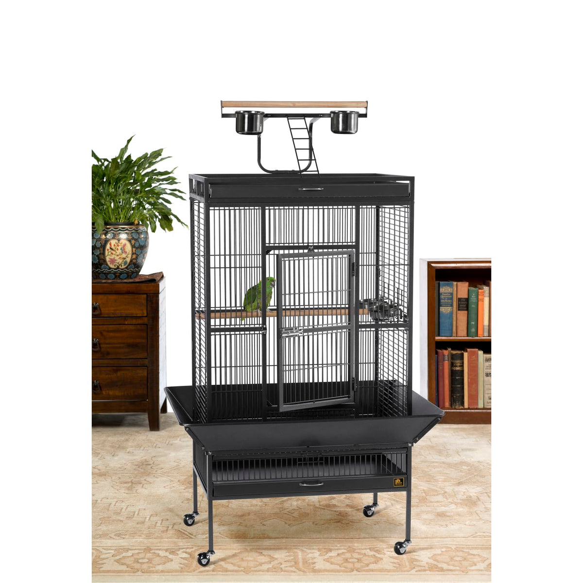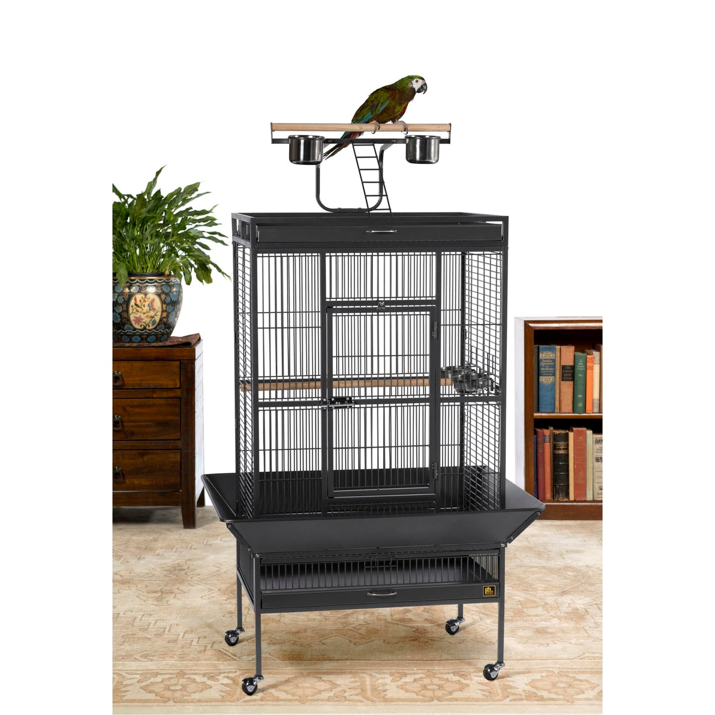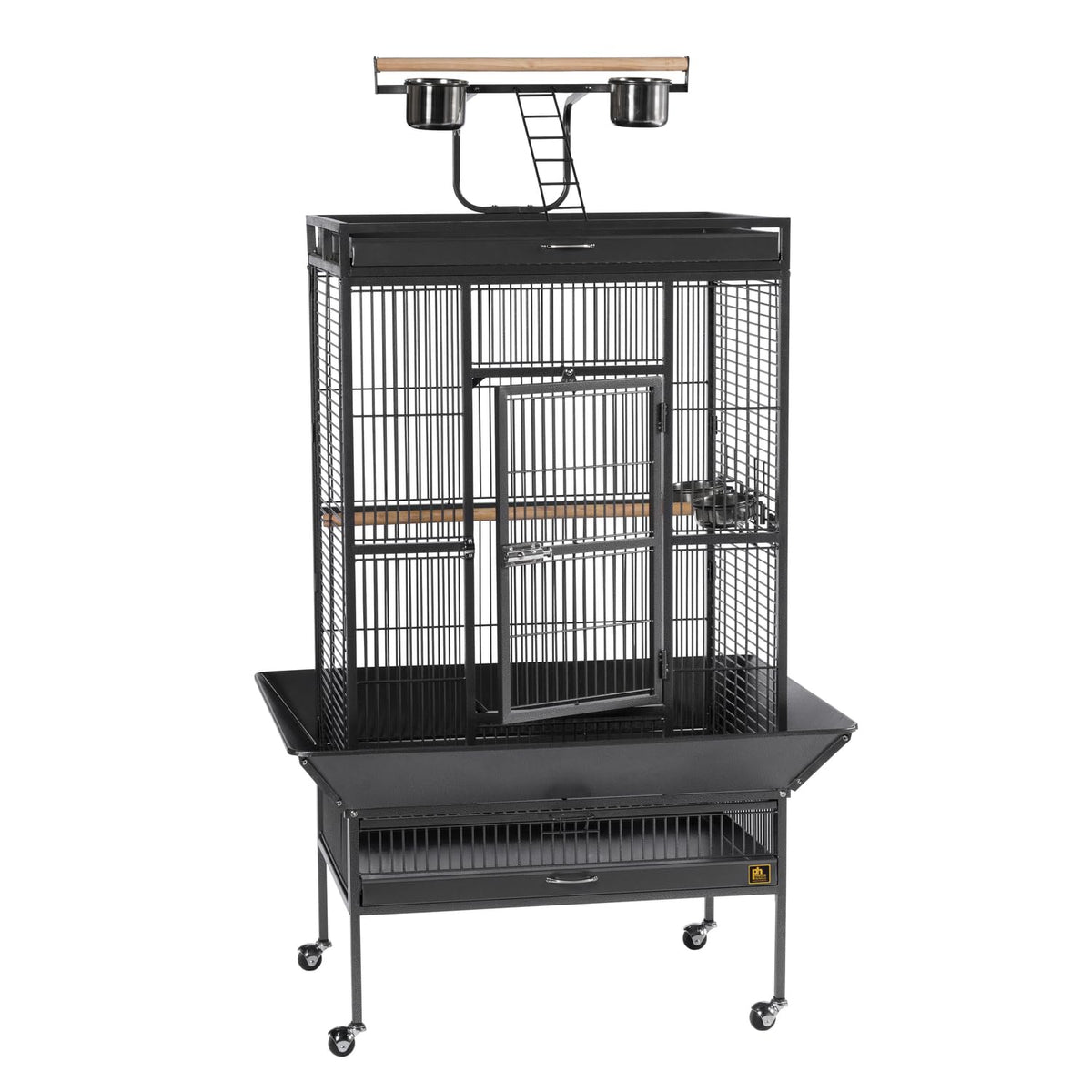 Q: What accessories come with the bird cage?A: The bird cage includes four stainless steel cups, two wood perches, a playtop, and a castered stand for easy portability.