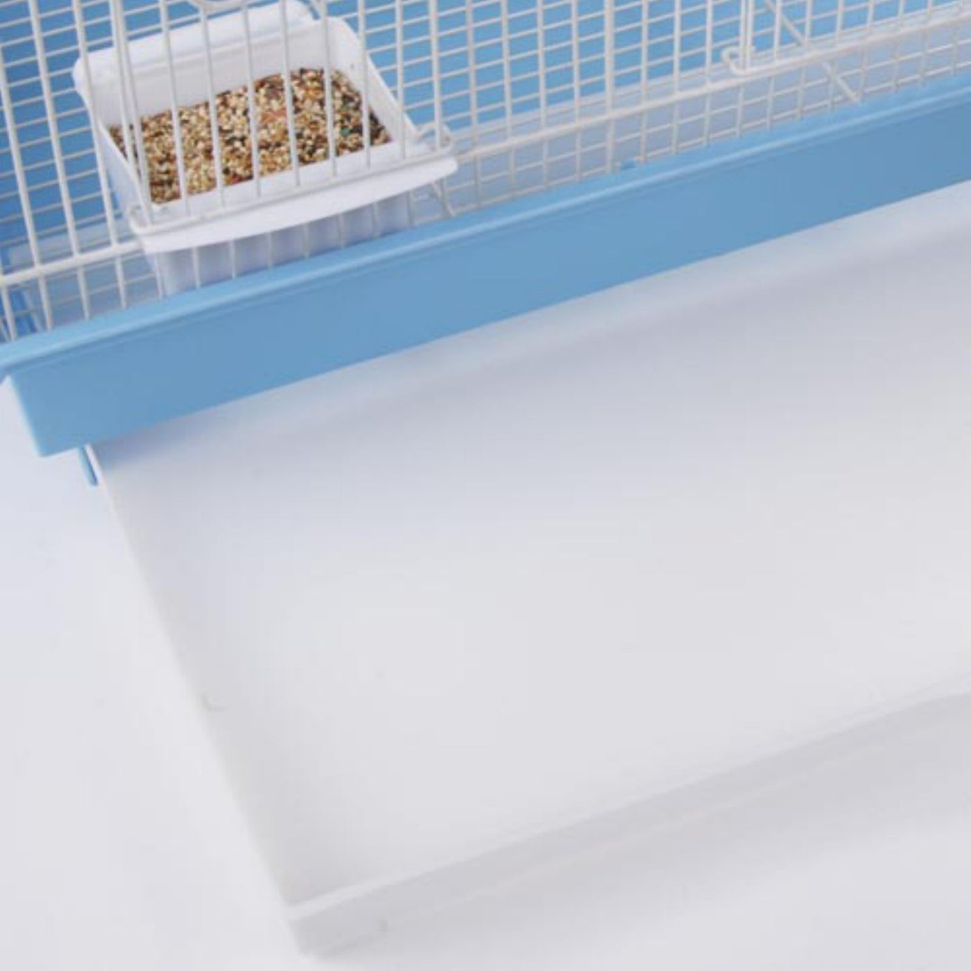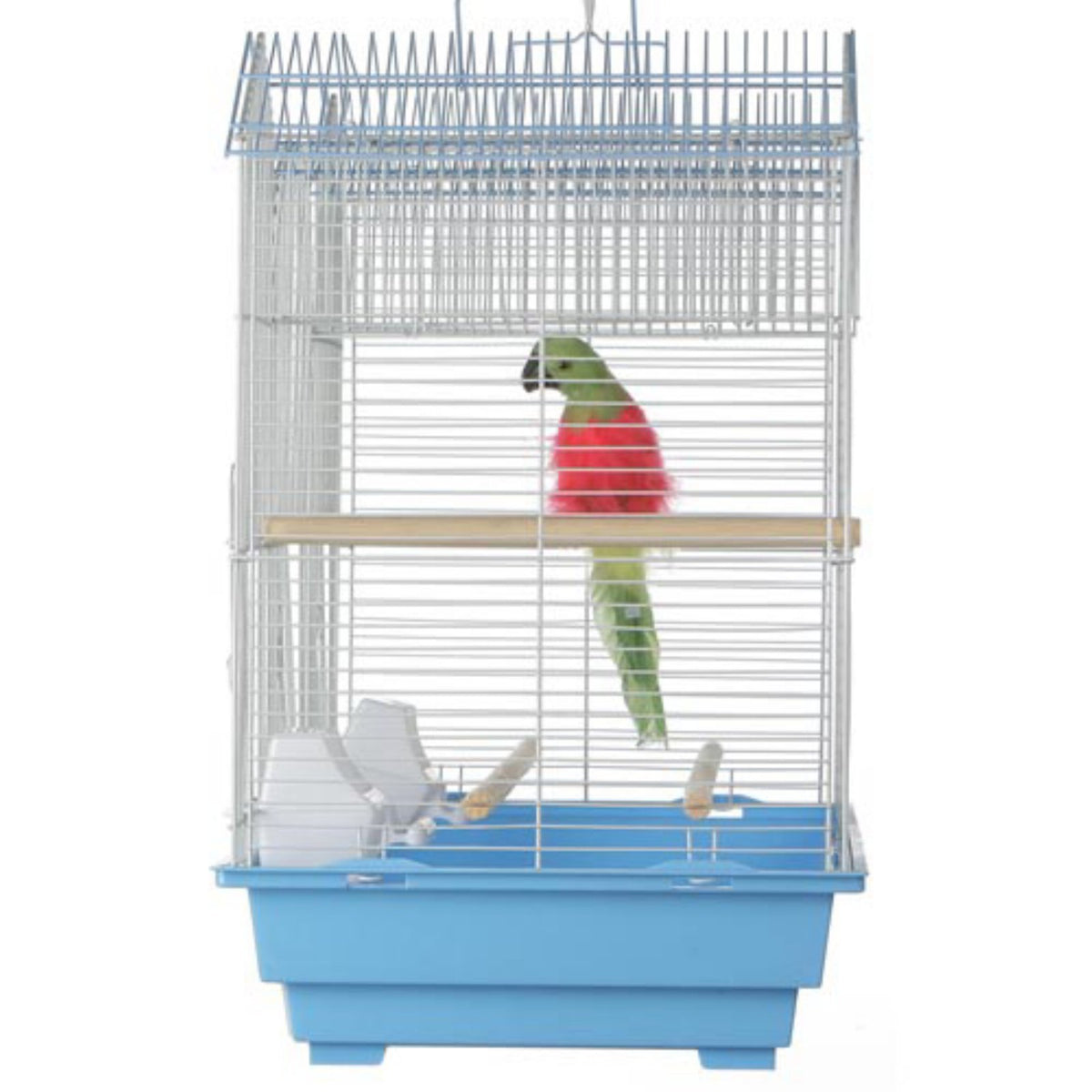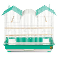 Prevue Pet Products Triple Roof Bird Cage Teal and White SP1804TR-2 features a unique triple roof design that is both functional and decorative. A removable bottom grille and pull-out tray allow for easy cleaning. Our Triple Roof Cage includes 2 plastic cups, 2 wood perches and is designed for parakeets, cockatiels and other small-medium birds. 26-inch L by 14-inch W by 22-1/2-inch H with-1/2-inch wire spacing.