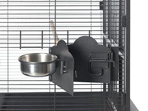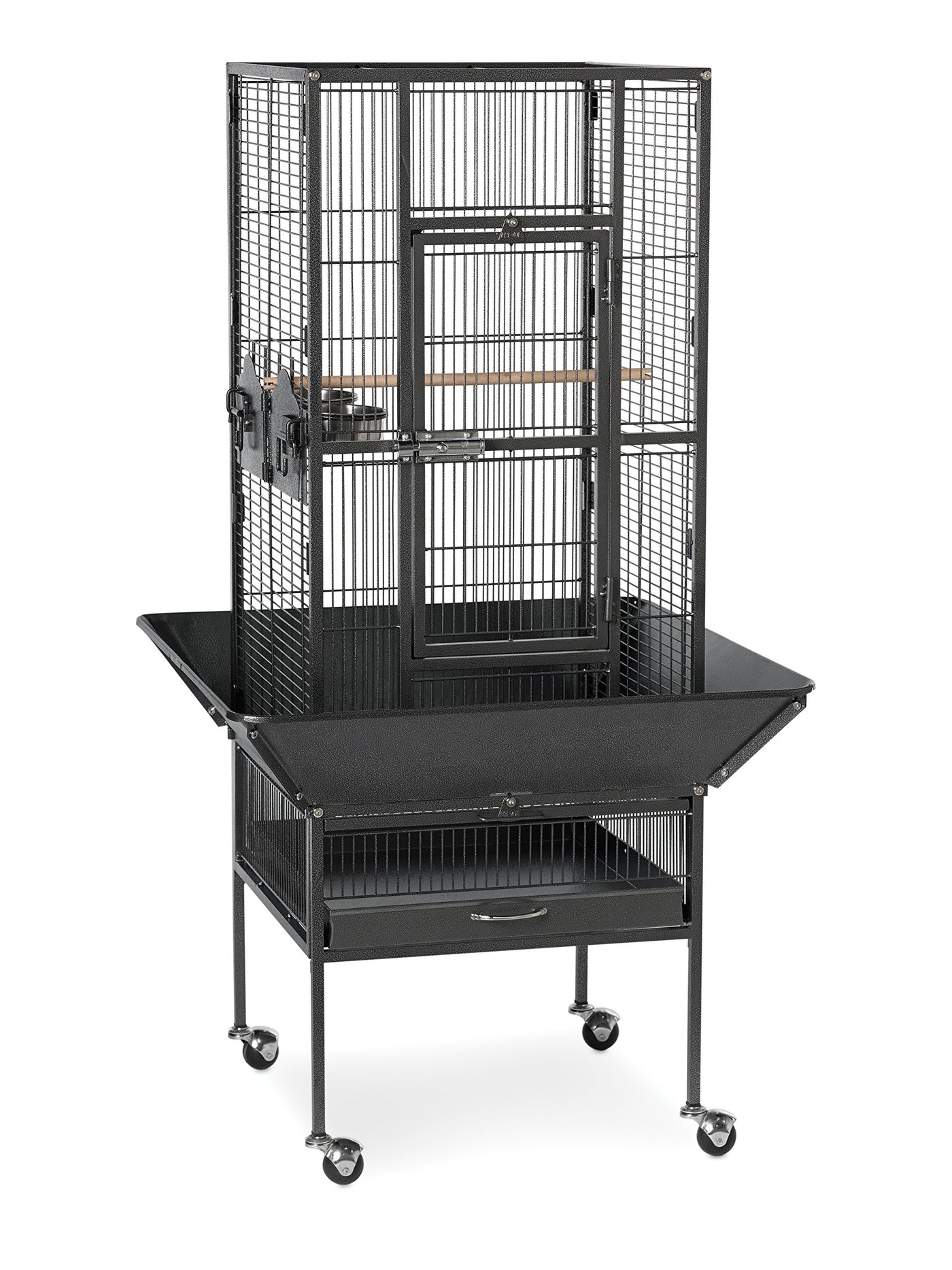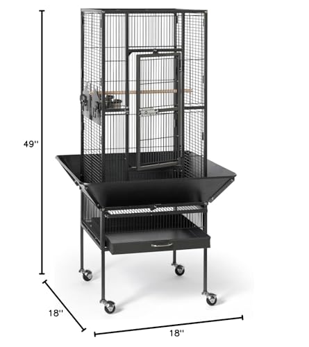 Prevue Pet Products Park Plaza Bird Cage Black Hammertone 3351BLK offers quality craftsmanship at an affordable cost. Constructed of durable wrought iron, this cage is designed for parakeets, canaries and other small to medium sized birds. Cage includes one solid wood perch, two stainless steel cups and an easy rolling stand with casters. Pull out grille and debris tray make this cage easy to clean while the rounded corner seed guards and solid-panel cup doors control debris outside the cage. A heavy duty lock plus additional windbell securely fast the large front door. Our Park Plaza 3351BLK cage in Black Hammertone measures 18 long, 18 wide and 49 high with wire spacing.