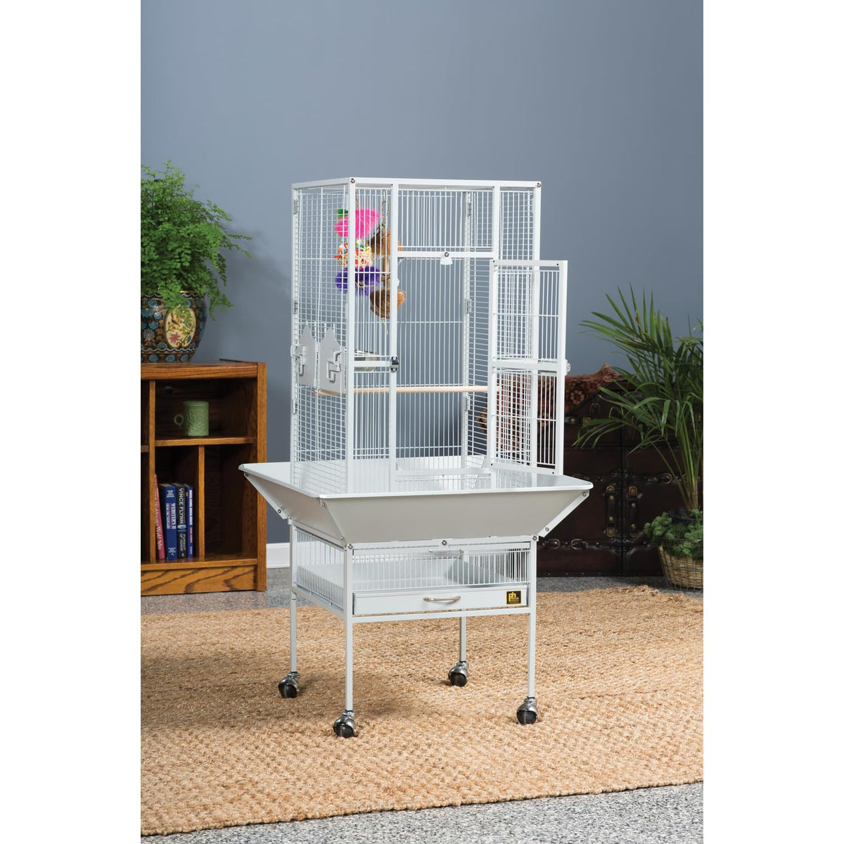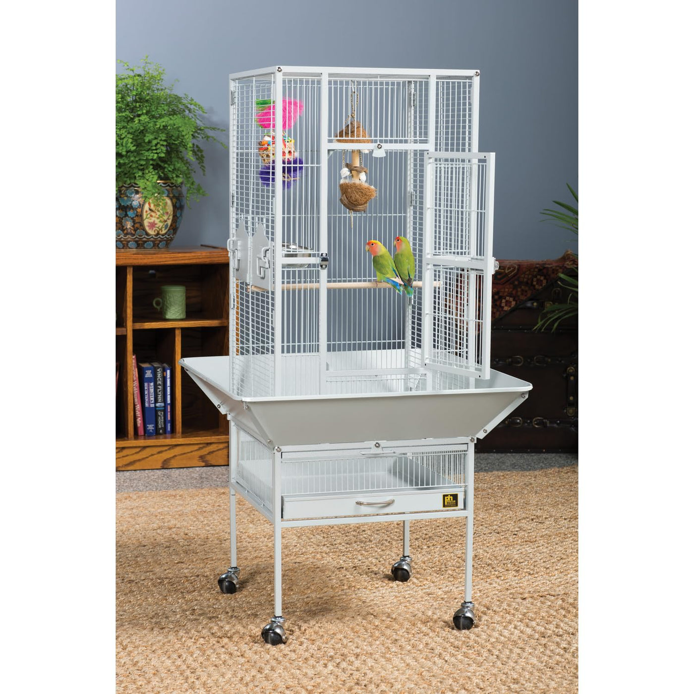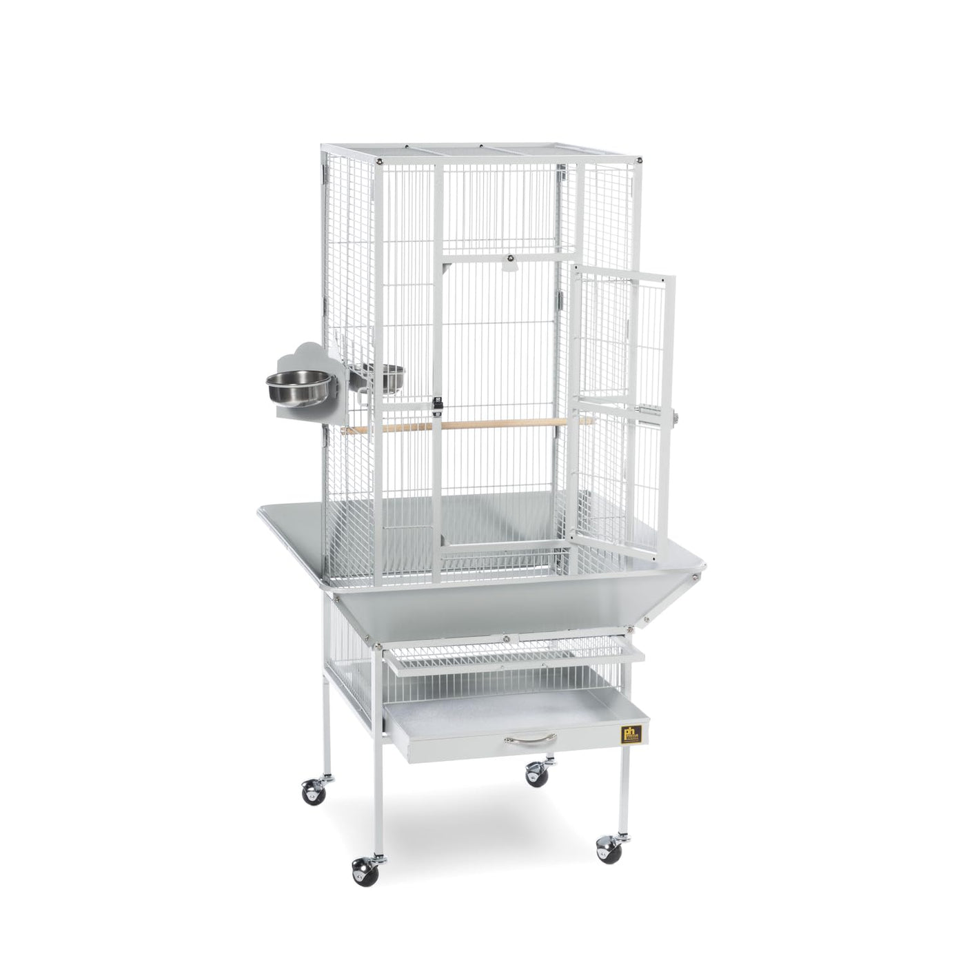 Prevue Pet Products Park Plaza Bird Cage Pewter 3351W offers quality craftsmanship at an affordable cost. Constructed of durable wrought iron, this cage is designed for parakeets, canaries and other small to medium sized birds. Cage includes one solid wood perch, two stainless steel cups and an easy rolling stand with casters. Pull out grille and debris tray make this cage easy to clean while the rounded corner seed guards and solid-panel cup doors control debris outside the cage. A heavy duty lock plus additional windbell securely fast the large front door. Our Park Plaza 3351W cage in Pewter measures 18 long, 18 wide and 49 high with wire spacing.