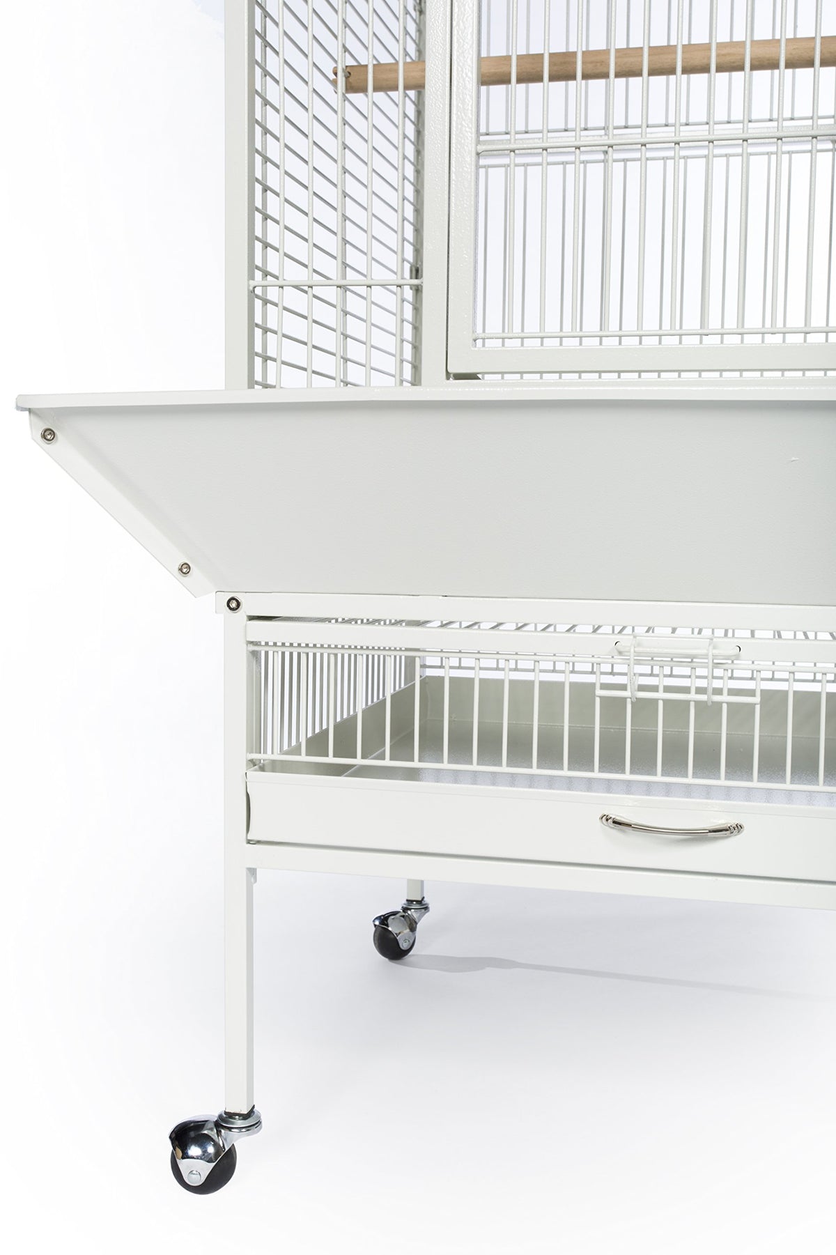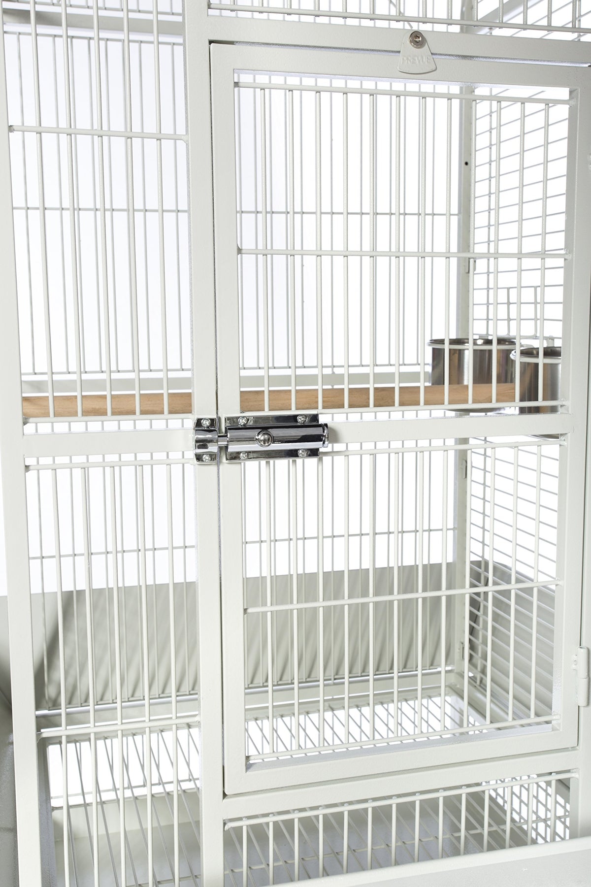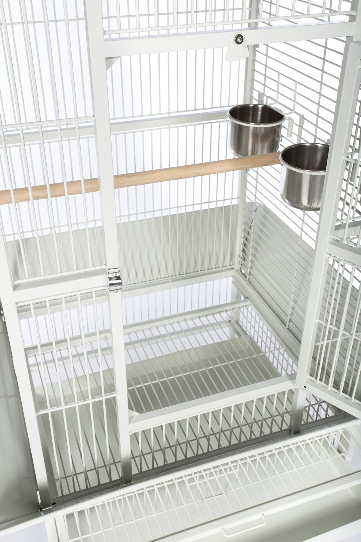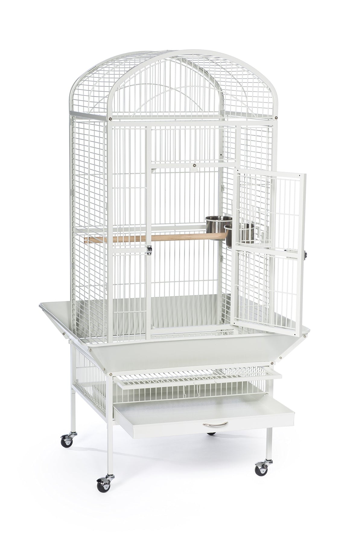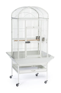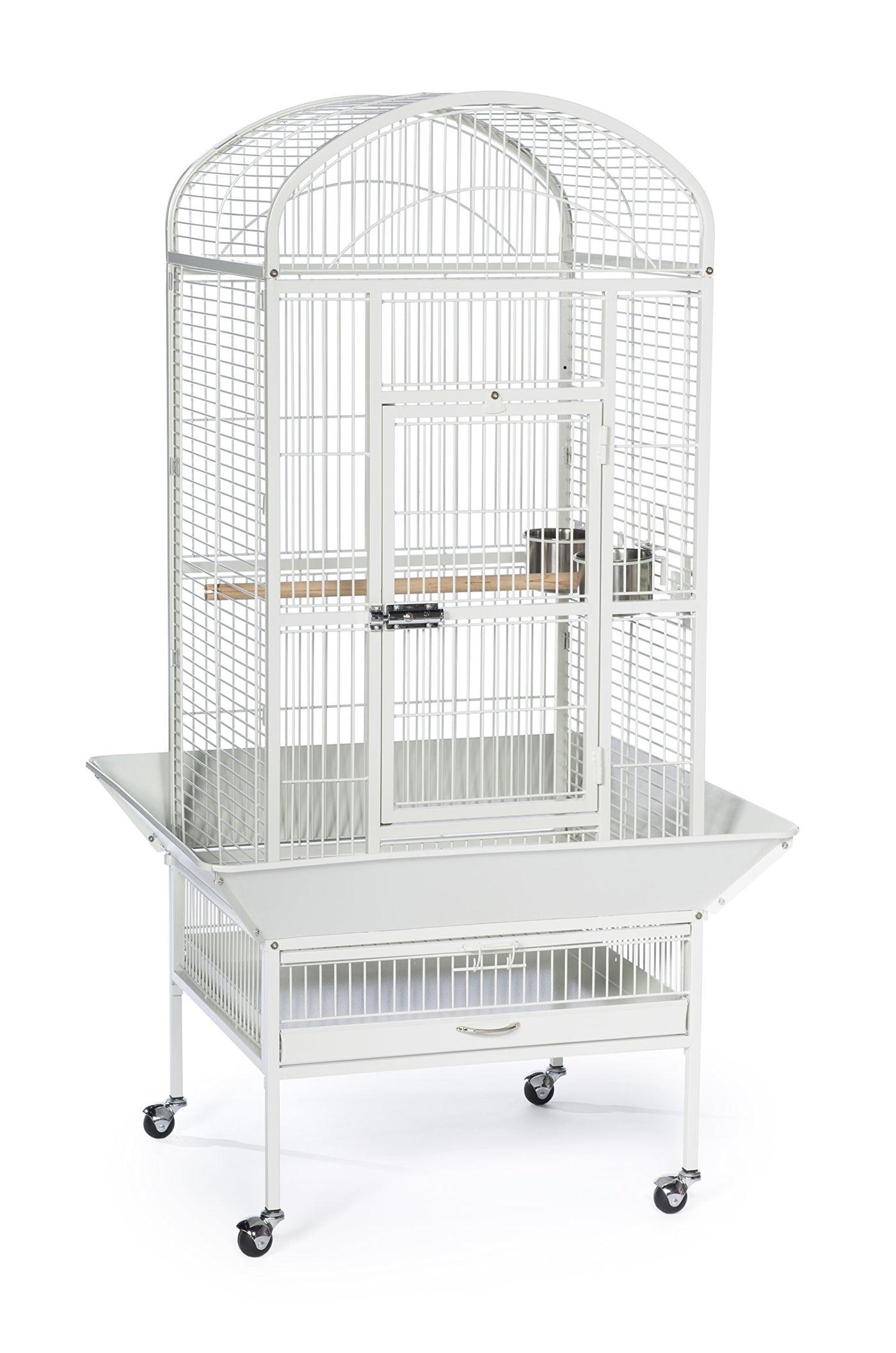 Prevue Pet Products Medium Dome top Bird Cage Chalk White 34522 features a roomy and refined dome top roofline with extra space for hanging toys and letting your bird stretch its wings. Expertly engineered in the USA to be easily assembled and loaded with owner, and bird, friendly features, our wrought iron constructed cage offers quality craftsmanship at an affordable price. Rounded corner seed guards help control mess outside of the cage and are less likely to damage walls or catch on your clothing, seed guard measurements are 32 1/4 long and 30 1/4 wide. Both grille and debris tray are removable for ease of cleaning and the integrated cage stand sits on sturdy, easy rolling casters. The large front access door measures 11 3/4 long by 21 3/4 high and closes securely with a push button lock plus a wind-bell lock to prevent any escape artists from pushing the door open. Included with this cage are 2 stainless steel 24 oz. food/water cups, which lock into place within the 4 long by 6 high cup doors and a generously sized 7/8 wooden perch. Finished with a durable and elegant chalk white powder coating, Prevue cages undergo independent lab testing and conform to the highest levels of pet safety. Prevue Pet Products Medium Dome top Bird Cage Chalk White 34522 is constructed from 9 & 10 gauge wire and measures 24 long, 22 wide and 59 1/2 high with 3/4 wire spacing.