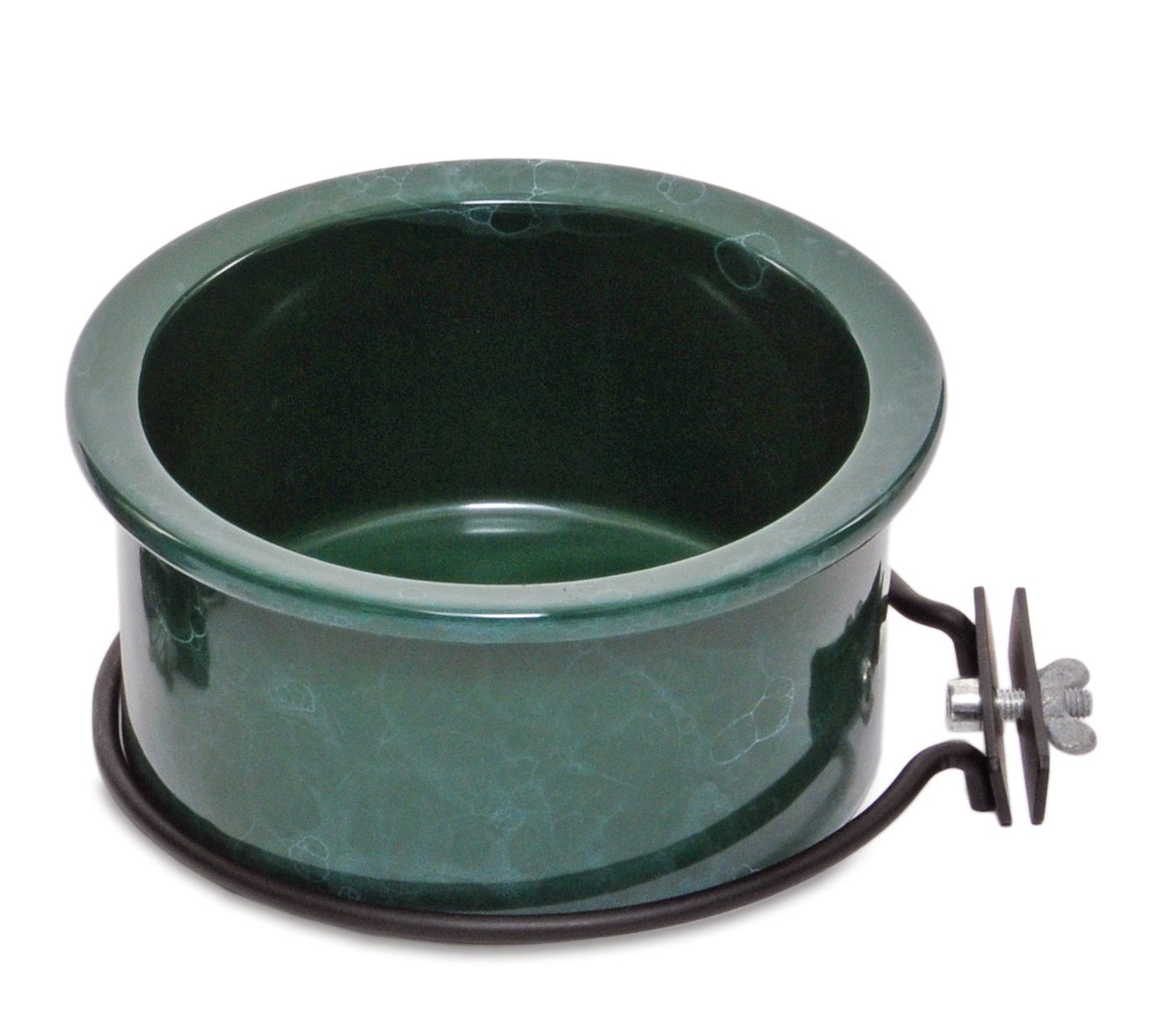 Prevue Pet ceramic marble crock dish with universal screw on holder. Designed to fit in most medium and large bird cages. This dish holds 24-ounce. Available in green color.