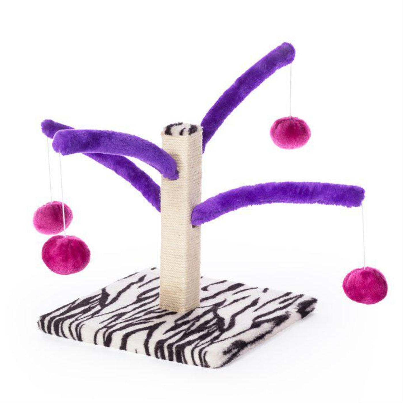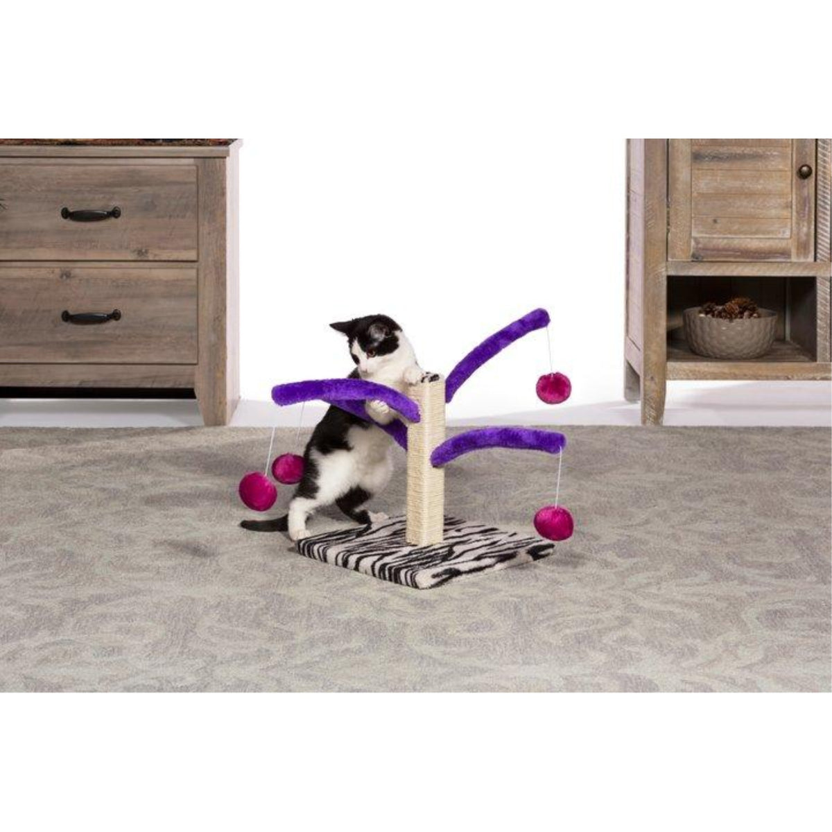 Prevue Pet Products Bounce ‘n Spring Cat Scratcher 708 is a visually engaging, interactive toy for your cat or kitten. A jute scratching post offers an appealing texture to cats, curbing inappropriate scratching behaviors and saving your sofa. Four plush fabric covered springs bounce and bend as your cat plays with the dangling swat toys. In a fun color combination of purple, fuchsia and zebra print with a natural jute scratching post, playtime has never been so much fun! Zebra print base measures 11 ¾’’ long and 11 ¾’’ wide. Overall measurements are 22’’ long, 22’’ wide and 11 ¾’’ high, perfect for cats of all ages, sizes and activity levels.