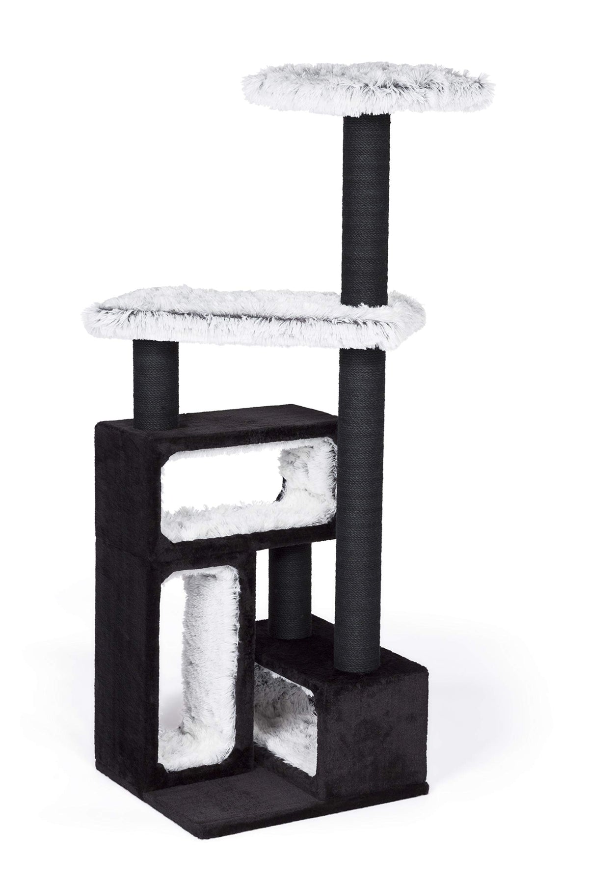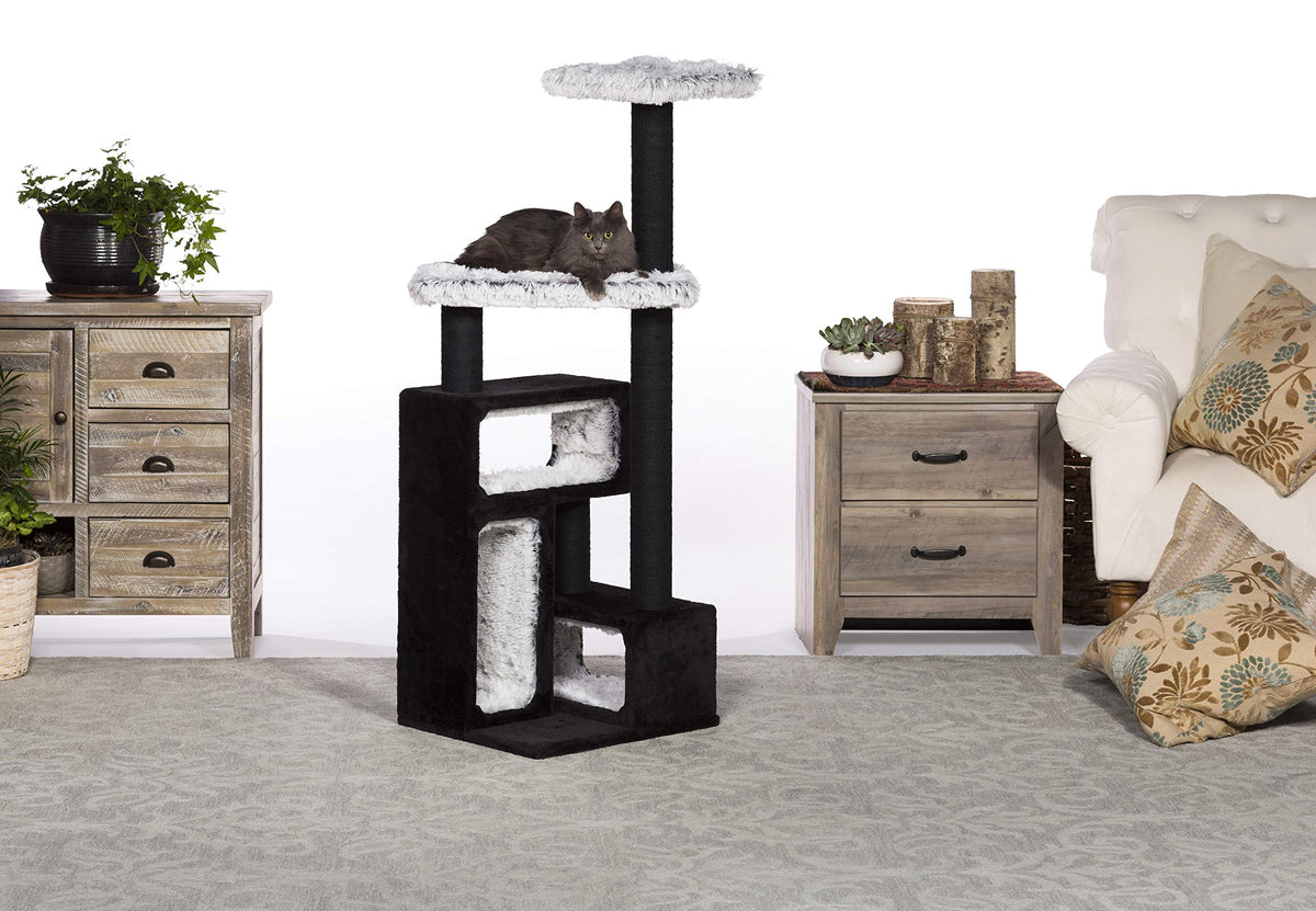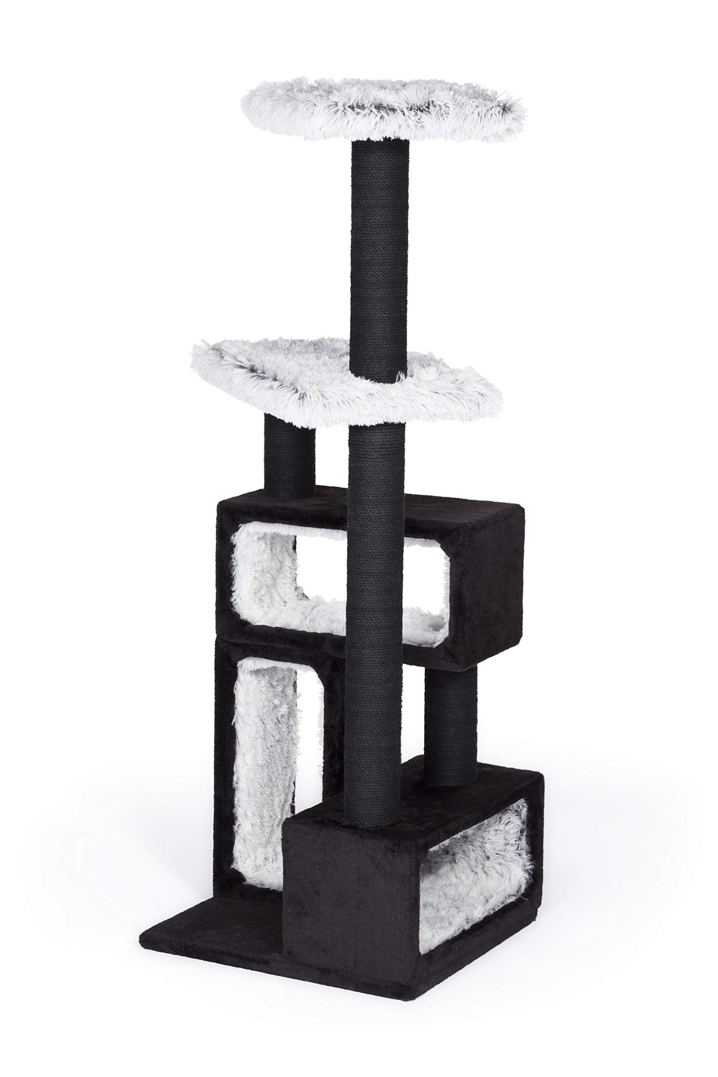 Prevue Pet Products Kitty Power Paws Domino Features Two Platforms Covered In Soft Plush, Three Hideout Spaces, And Jute Scratching Posts. Scratching Posts Help Satisfy Natural Clawing Instincts, Helping To Keep Your Furniture Safe From Destructive Restless Behaviors. Hideout Spots And Platforms Are Coated With Soft Plush Floors And Walls, Giving Your Cat Or Cats Comfortable Spaces To Play, Rest, And Relax. 24''L X 25''W X 52.5''H. Base Is 19.25''L X 17.5''W. Black And Frost White Color.