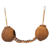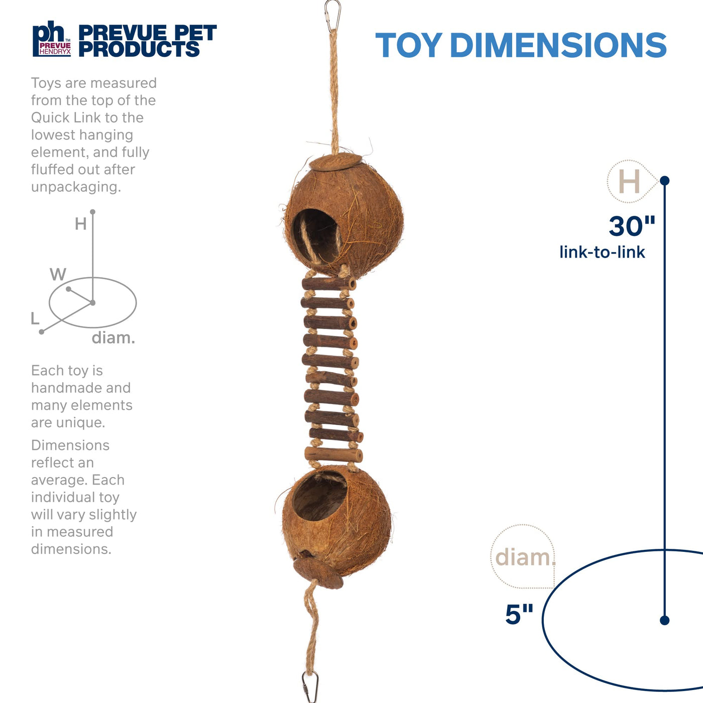 Prevue Pet Products Naturals double coconut walk for small animals & birds 62818 is handmade from 100-percent natural, sustainable, materials providing your bird with mental stimulation and rugged physical play. Made with environmentally conscious coconut shells, sisal rope and Rubber wood this toy encourages foot and beak exercise in birds and also makes a great hideout and activity Center for small animals including mice and small hamsters. Toy connects easily to cage with quick-link attachments and is hand made - actual measurements may vary slightly. As always, supervise animals at play. Our Naturals double coconut walk for small animals & birds is approximately 18 ½’’ long from link to link and each coconut is approximately 4’’ in diameter.