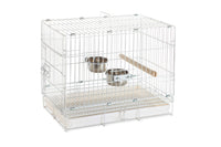 Prevue Pet Products Travel Cage is an ideal solution for short-term traveling. Perfect for small parrots, the 9 inch x 9 inch side access door allows birds to walk right into the cage. A removable bottom grille and plastic pull out tray make cleaning effortless while storage is simple as you can fold the cage flat. Our Travel Cage is available in White only, includes two stainless steel dishes plus one perch and measures 20-inch long, 12-inch wide, 16-inch high with 3/4-inch wire spacing.