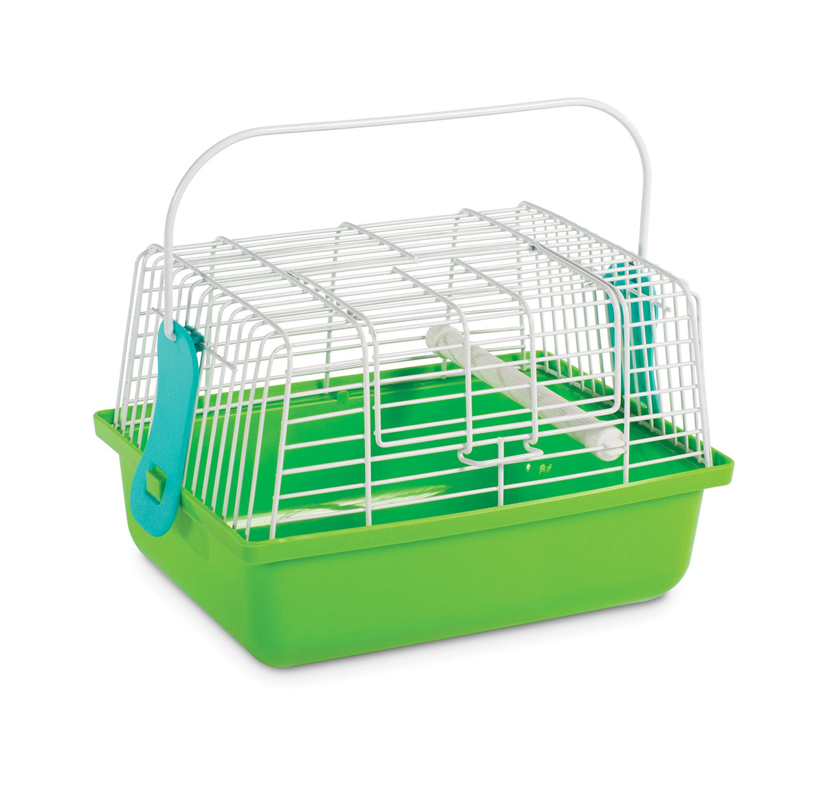 Prevue Pet Products Travel Cage for Birds and Small Animals Green SP1304GREEN is a compact carrying cage for your small bird or small animal. Ideal for temporary use when traveling brief distances with your pet, included perch is designed for small birds and can be removed for transporting small animals such as hamsters or gerbils. Large top opening door is large enough to fit your hand in the cage and turquoise clips secure the wire mesh to the plastic base. With a convenient carrying handle, our Green Travel Cage for Birds and Small Animals measures 9 Long, 5 5/8 Wide and 6 1/8 High with 3/8 wire spacing. Base alone is 2 7/8 deep.Warnings :Inspect the product periodically and remove from use if it becomes worn or damaged