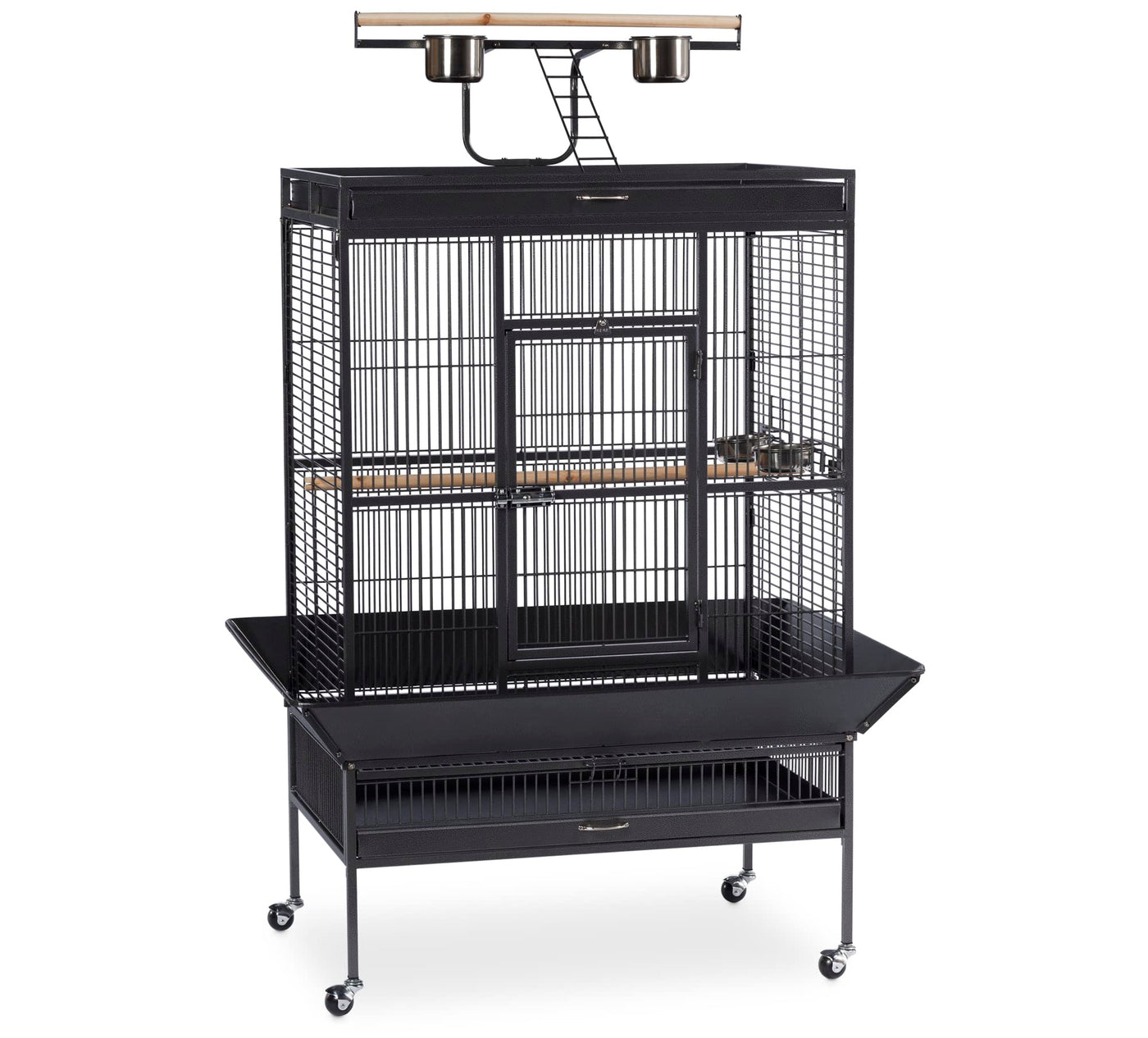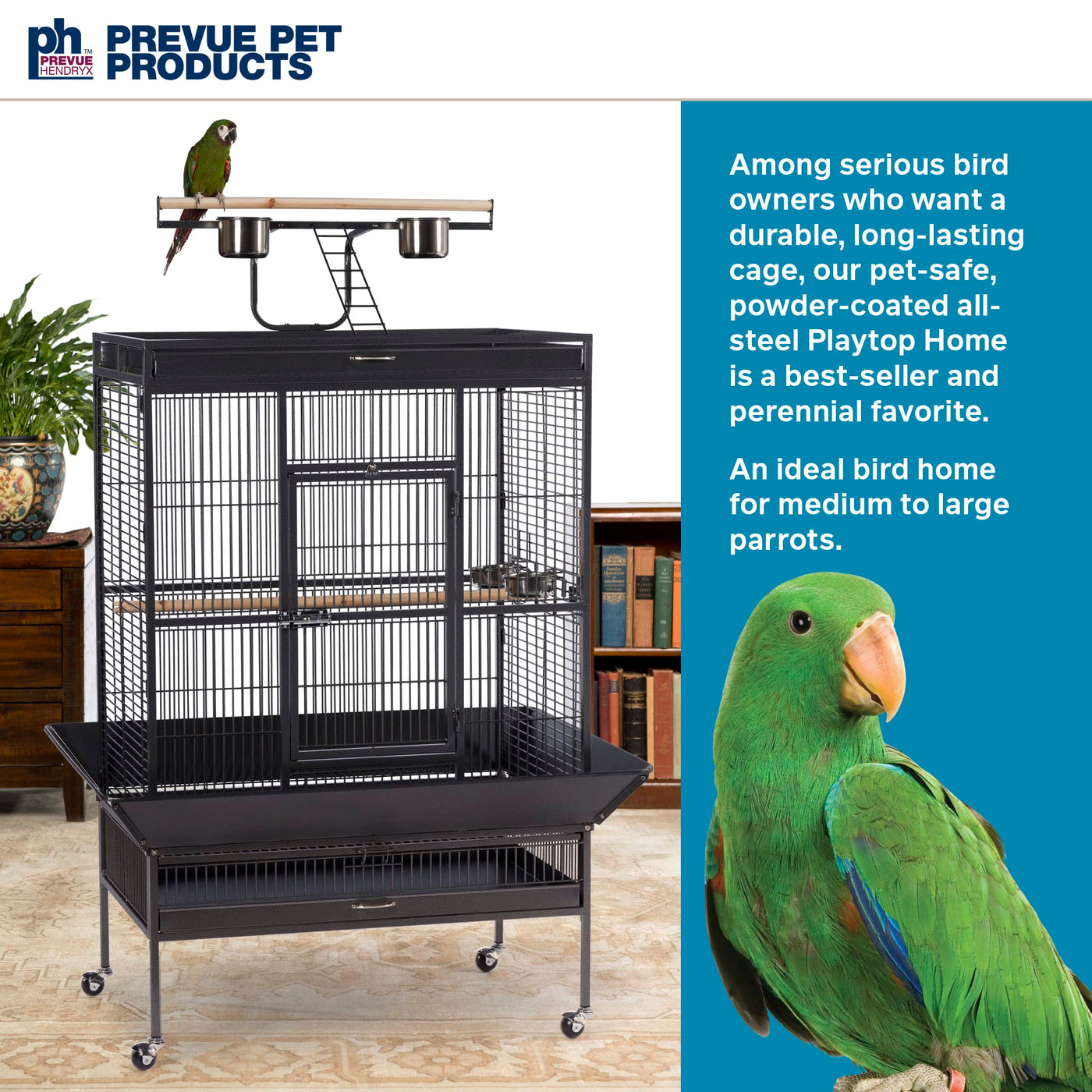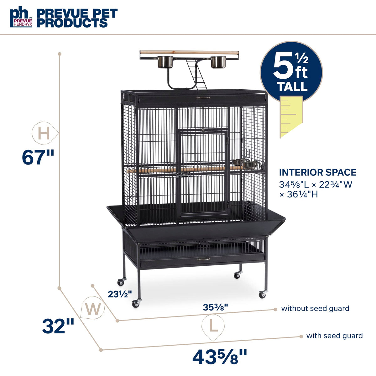 Prevue Pet Products wrought iron select cage in black hammertone offers quality craftsmanship at an affordable cost. Constructed of wrought iron with a cagetop playstand to keep your bird entertained and content, the heavy-duty push button lock keeps your bird securely inside its cage when playtime is over. This select bird cage also includes four stainless steel cups, two wood perches and a castered stand for portability. Both drawers and bottom grille are removable for ease of cleaning while the rounded corner seed guards control mess around the cage. Our wrought iron select cage in black hammertone has 3/4-inch wire spacing and measures 35-3/8-inch long, 23-1/2-inch wide, 67-inch high without the seed guard. Exterior cage measurements with seed guard are 43-5/8-inch long, 32-inch wide, 67-inch high. Interior cage measurements are 34-1/2-inch long, 22-3/4-inch wide, 36-1/2-inch high.