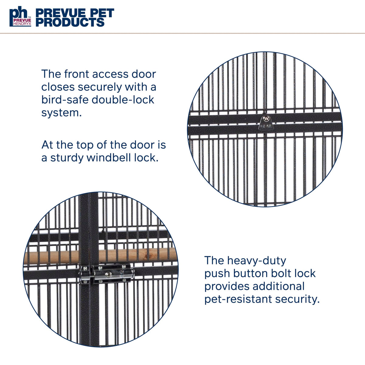 Q: Is the Prevue Pet Products Bird Cage safe for my pet?A: Absolutely! The cage is constructed from durable wrought iron and features a non-toxic powder-coated finish. Additionally, the heavy-duty push button door lock ensures that your bird remains securely inside the cage.