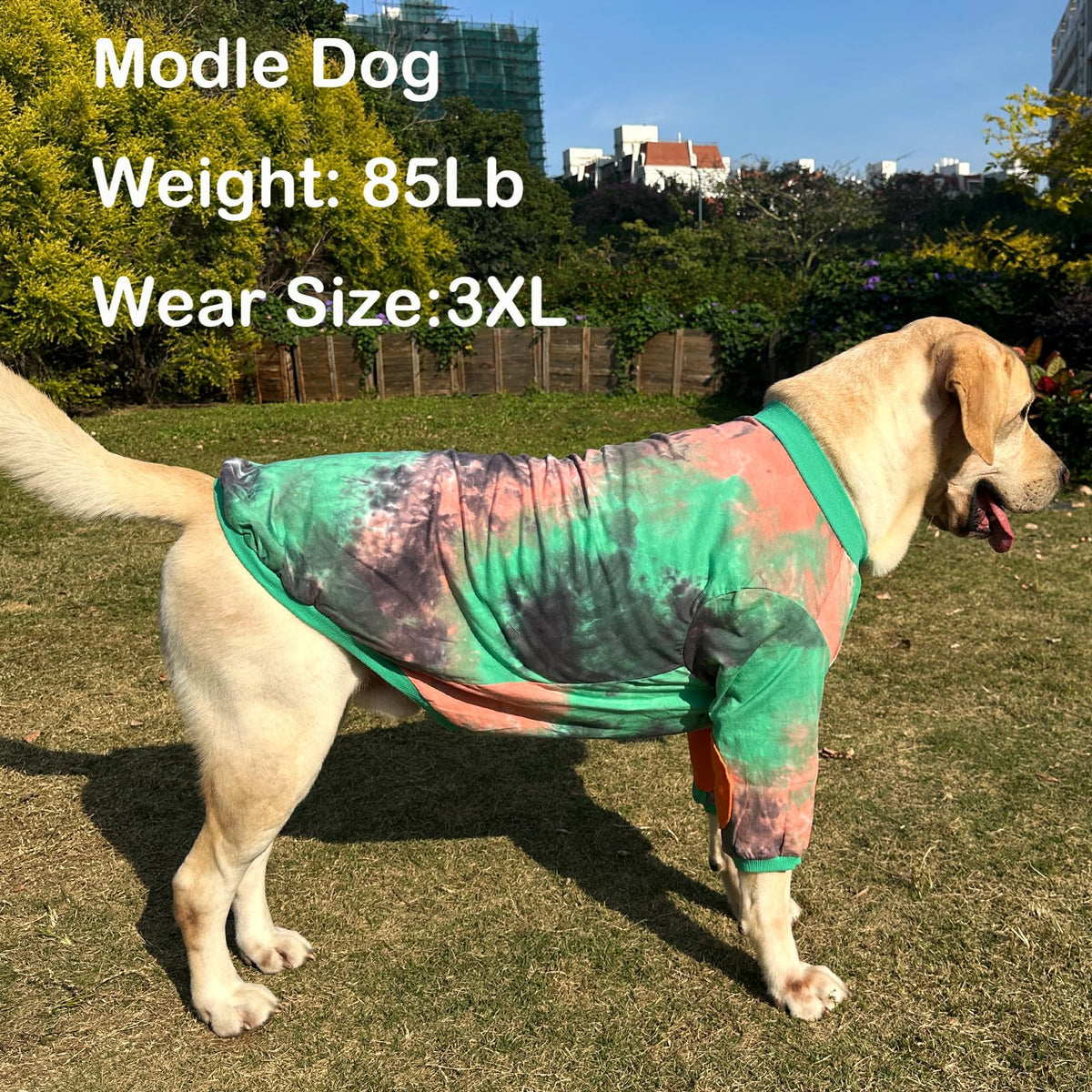 aterialade from a cotton blend T-shirt material and protecting your dogs skin from allergens Breathable Soft fabric and elastic it suitable for daily wear or pajamas at home esignThe shirtAs hemline neckline and cuffs with elastic design can easy to put on and take off Also avoid falling off and wont tight Furthermore it doesnt shrink or fade after machine-wash Highlight designWe added a wear-resistant fabric to reduce the wear on the dogs Knee it can protect their legs better Eye-catching patternTie Dye color design is fashion style it is eye-catching make your pets look more energetic and fashionable it perfect for any occasions and youll find your pets quickly when theyre playing outside Sizeoggy shirts come on a variety of sizes from S to 3XL Please see size chart on pics for reference