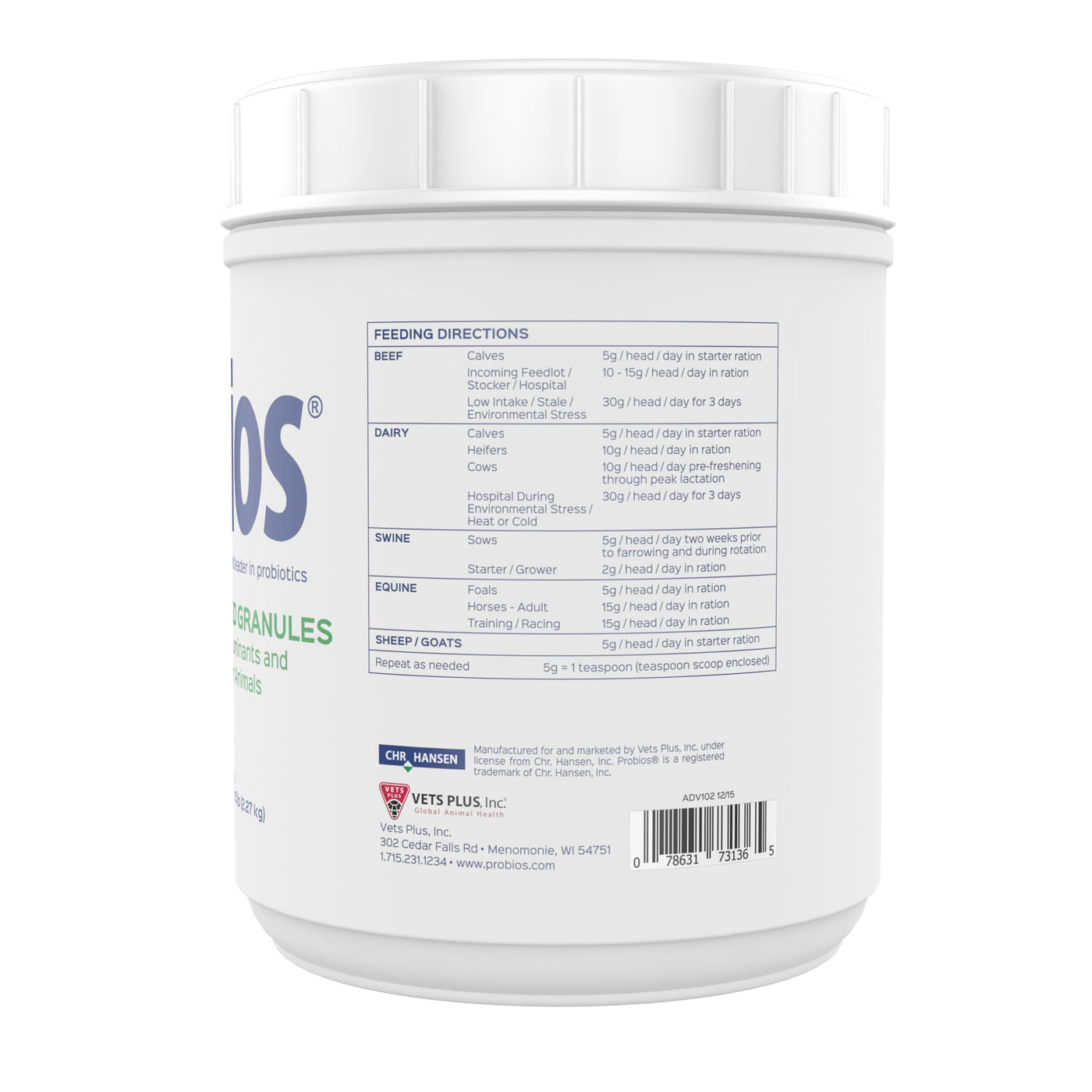 Probios(R) Feed Granules Probios(R) Feed Granules contain essential nutrients and help promote gastrointestinal health. This formula is a great source of live, naturally occurring microorganisms to assist in maintaining normal digestive function during times of stress from illness, weaning, or diet changes. Features: Improves feed conversion Can help increase growth Stimulates appetite Item Specifications: Guarantee: Lactic Acid Bacteria* not less than 10 million CFU** / g *Enterococcus faecium, Lactobacillus acidophilus, Lactobacillus casei, Lactobacillus plantarum, Other ** Colony Forming Units Ingredients: Calcium Carbonate, Sodium Silico Aluminate, Dried Enterococcus Faecium Fermentation Product, Dried Lactobacillus Acidophilus Fermentation Product, Dried Lactobacillus Casei Fermentation Product, and Dried Lactobacillus Plantarum Fermentation Product. Directions for Use: Use on Horses, Beef Cattle, Dairy Cattle, Swine, Sheep, and Goats See Product Label for Feeding Directions For additional product information, please see clickable links listed under Downloadable Resources.