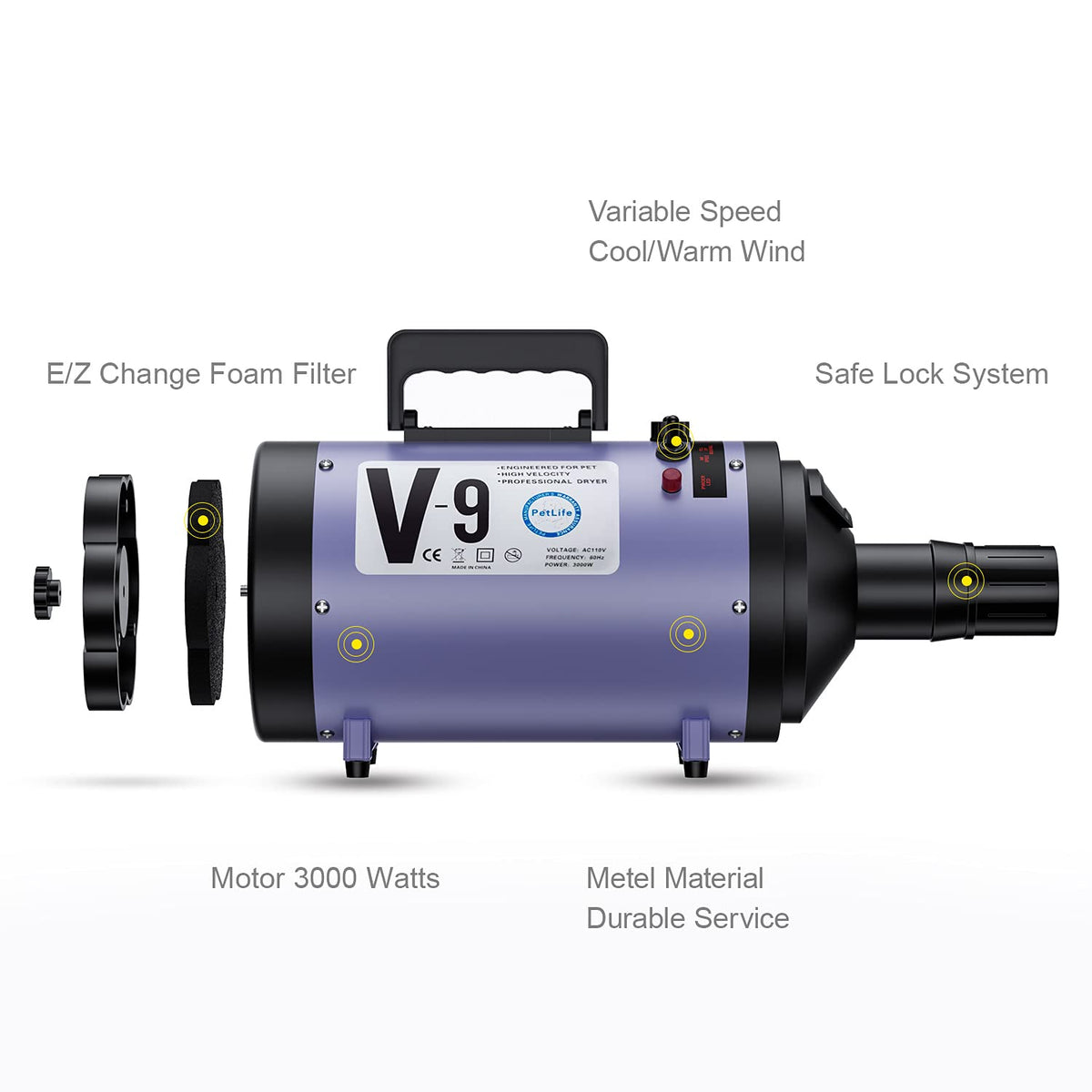 Quick Dry :Dog dryer blower equipped with a powerful and stable motor provides strong wind could quickly dry your dog in short time The wind volume is adjustable you can control the speed at your wish LOW NOISE: To make the dog hair dryer noise as lower as possible our engineer designed the noise reduce system by foam The dog grooming dryer also is built in a high quality motor to lower the noise resource This lower noise force dryer is great gift for your pet 4 NOZZLES & EXPANDABLE HOSE: comes with 4 different Pro styling nozzles for all dog breeds hair shapes and body parts The expandable hose could be stretched from 3ft to 8ft long which makes this dog dryer handy to use both for household or salon FOR ALL SEASONS AND BREEDS: The dog grooming hair dryer owns heating function coolhot wind temperature from 30 85 to 70158 quickly produce warm wind in 3-5 seconds in cold days perfect for small medium and large dogs PetLife is a Pro dog dryer manufacturer and provides top quality products for many years Product can be used by Ac 110125V it will break down under invalid voltage