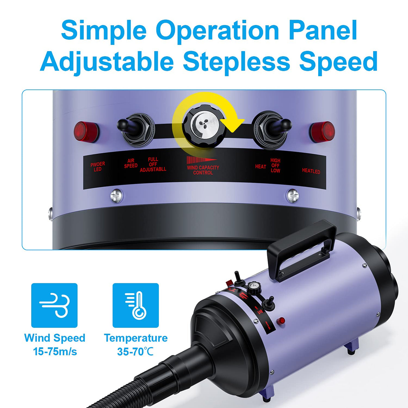 Professional Dog Grooming Dryer With Heater, 4.3Hp High-Power Dog Blower, Variable Speed Adjustable, Low Noise Pet Hair Dryer For All Breeds(Purple)