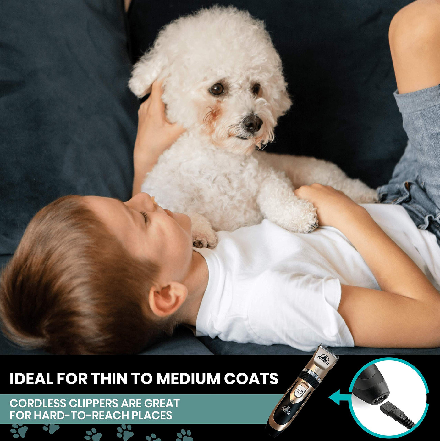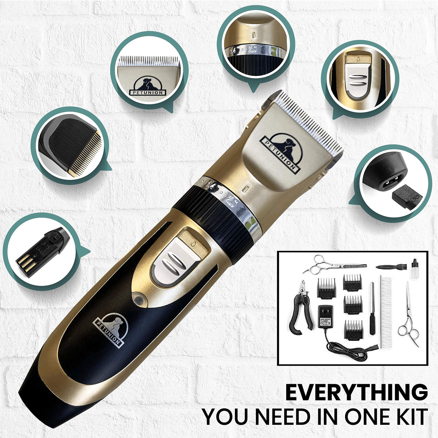 Everything You Need in One Kit - If youre looking for the complete pet grooming kit for your dog cat or other furry friend look no further Premium dog grooming clippers to help you professionally groom your pets coat and nails - Including clippers multiple guards nail trimmers scissors and more Low Vibration & Low Noise clippers - Have an anxious pet Have no fear Pet Unions low-vibration precision motor ensures whisper-quiet operation and a stress-free grooming experience for your little buddy Rechargeable & cordless - Thanks to an ergonomic design & rechargeable battery grooming with the Pet Union grooming kit for small and large dogs is a breeze for even the hardest-to-reach areas Adjustable Safe & Sharp Blades - Pet Unions grooming combs are contoured for the most skin-friendly grooming experience and thanks to the Precision-cut titanium blades theres no uncomfortable pulling at your pets hair Just a safe easy and comfortable grooming experience Proven Quality - Be sure to thin a thick coat with scissors to avoid any jamming One of the best track records and ratings history of any dog clippers for grooming on the market