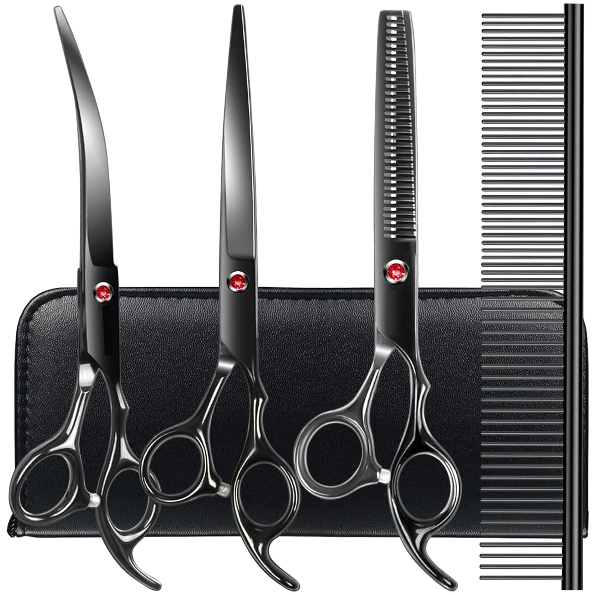 Tinmarda, Enjoy Grooming Time With Your Dog. Why Choose Our Dog Grooming Scissors Kit?Straight Scissorsthe Straight Shears Are Made From Razor-Sharp Stainless Steel That Ensures Precise And Speedy Trimming, Perfect For Cutting Length Off Your Pets Fur On Legs And Back. Curved Scissorsthis Professional Tool Is Paw-Fect For Curved Surfaces Like Around The Ears Or On A Poodles Head. Since They Are Designed To Deliver Superior Precision, They Are Also Great For Cleaning Up The Chest Or Rib Cage.Thinning Scissors Perfect For Blending, Thinning And Cleaning Up Wiry Coats. They Are Also Especially Effective When Used Around Your Sidekicks Face And Even On Delicate Areas Like The Inside Corners Of Her Eyes.Grooming Combfeatures A Combination Of Rounded-Tip Teeth, Making It Easy To Effortlessly Glide The Comb Through Your Pals Fur.Order Come With:1 * 7.3-Inch Thinning Shears1 * 7.7-Inch Curved Scissors1 * 7.7-Inch Straight Scissors1 * Grooming Comb1 * Cleaning Cloth1 * Black Leather Case