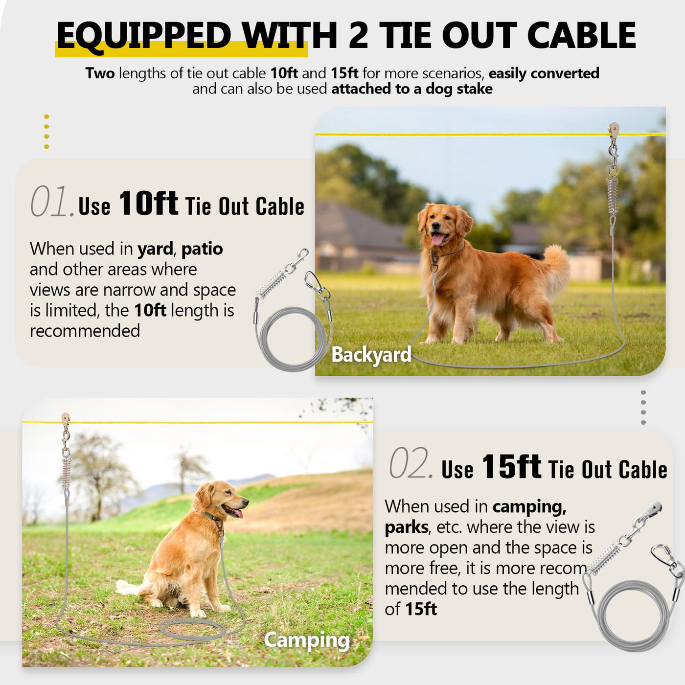 Introducing Our Upgraded Dog Runner For Your Yard - The Perfect Outdoor Dog Lead For Large Dogs Weighing Up To 250Lbs! Adjustable Long Line Designed, Suitable For Both Small And Large Yards. Our Heavy-Duty Dog Trolley System Comes With A 30Ft Long Lead Cable, Equipped With 2 Tie-Out Cables Measuring 10Ft And 15Ft, Offering Ample Room For Your Furry Friend To Run And Play, While The Swivel Hook And Anti-Tangle Design Provide Maximum Freedom Of Movement. Whether You'Re In The Backyard, Park, Or Camping, Our Dog Aerial Run Keeps Your Pet Safe, Securely Restrained And Unable To Escape. Our Long Dog Runner Cable Is Constructed From Chew-Resistant And Rust-Proof Stainless Steel Wire, Ensuring Long-Lasting Durability. The Pvc Coating Protects Against Abrasion And Fading, Further Adding To Its Strength And Reliability. This Dog Zip Line Is Straightforward To Set Up, And Typically Requires No Tools. The Trolley System Comes With Clear Instructions For Easy Setup. With Our Dog Trolley System, Take Your Furry Friend Along On Your Outdoor Adventures. Make Your Dog Feel Free To Run, While Sustaining Safety And Comfort With Our Outside Heavy-Duty Long Dog Run Cable. Don'T Let Pesky Tie-Out Cable Leash And Limited Space Hold Your Dog'S Energy Back - Upgrade To Our Dog Runner Today!