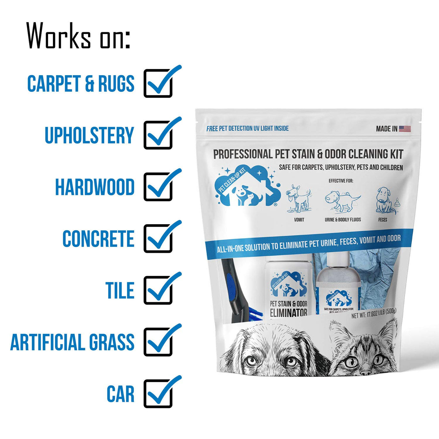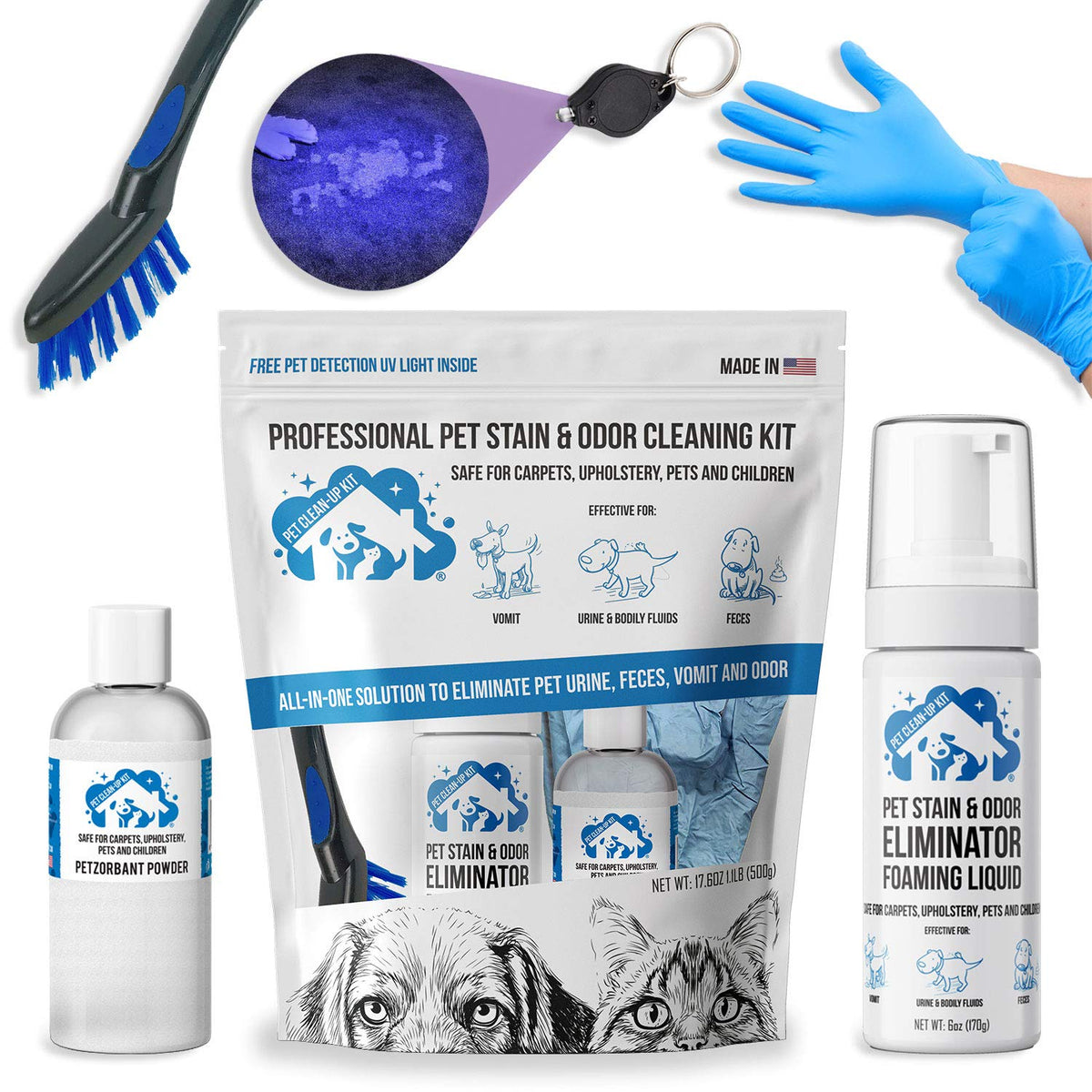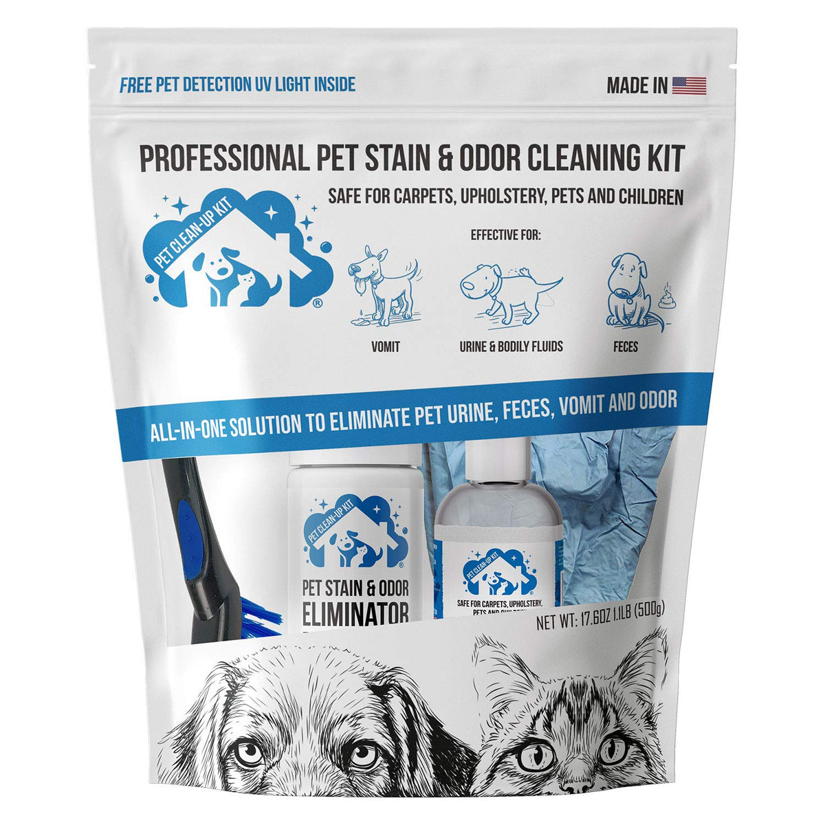 Pet Cleanup Kit Is Designed To Remove Any Stain Or Odor Caused By Urine, Feces, Vomit, Or Other Organic Matter. Our Unique Formula Removes Stains And Odors From Carpets, Rugs, Upholstery, And Hard Surfaces. Pet Cleanup Kit Is The Ultimate All-In-One Solution To Remove Pet Mess From Any Surface. It Comes With All The Tools You Need In A Small Package, So You Can Clean Up Pet Accidents With Ease.