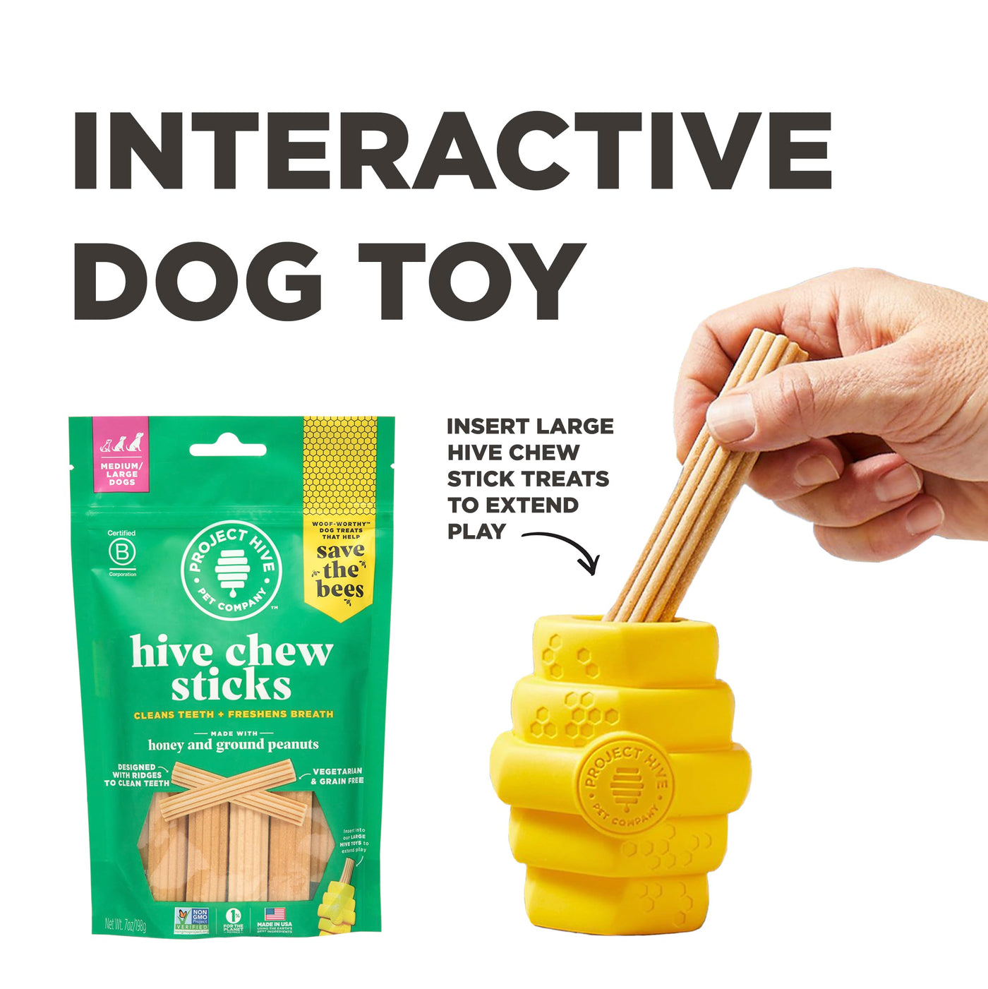 Our Iconic Hive Chew Toy Is The Perfect Multifunctional Toy For Larger Dogs. Its Erratic Bounciness Keeps Dogs Happily Engaged During Fetch And Play. Dogs Love To Gnaw On The Unique Hive Design, And You Can Insert Our Tasty Hive Chew Sticks For Large Dogs In Either End For Extended Enjoyment. The Hives Bright Yellow Color Makes It Easy For You And Your Dog To Find-Both Indoors And Out In Nature. Speaking Of Outside, The Hive Floats-So You Can Toss It Into Any Lake, Pool, Or Body Of Water For More Fun! And You Know What Else? Your Purchase Helps Save The Bees!
