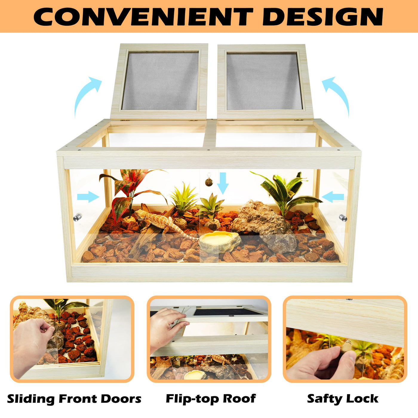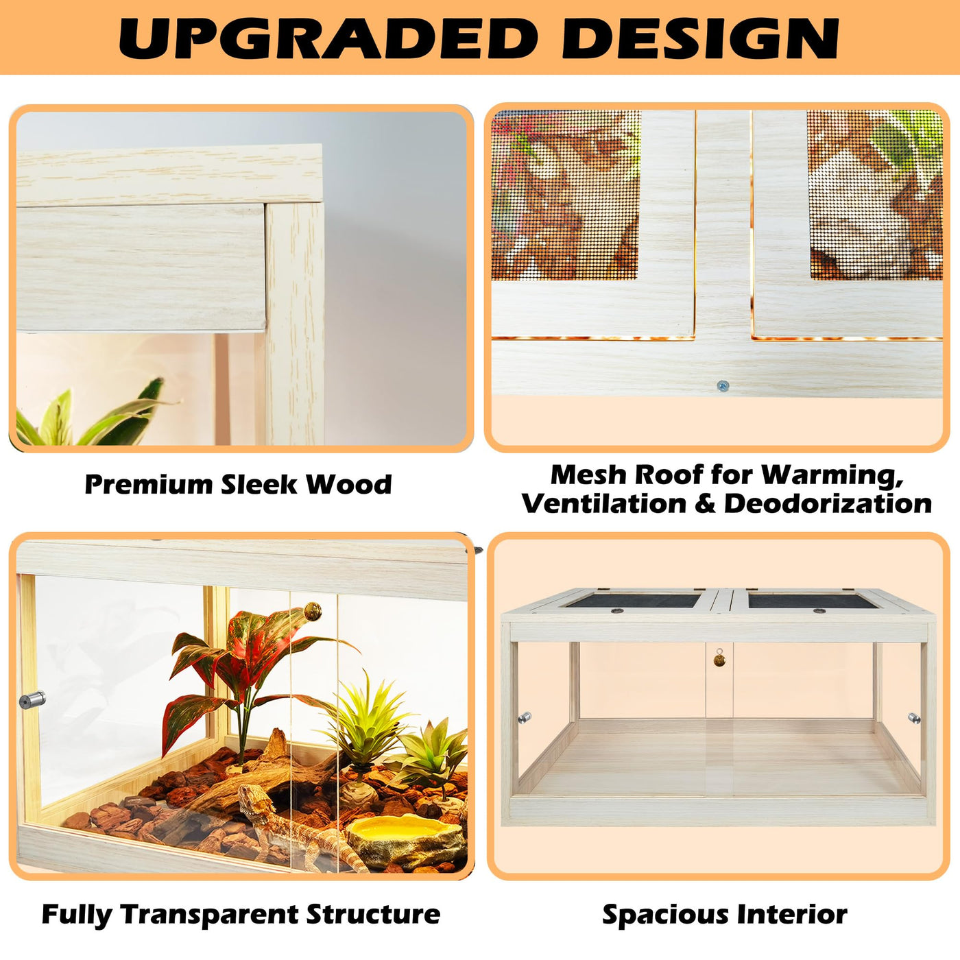?Premium Reptile Habitat?For Reptile Aficionados Seeking Top-Notch Accommodations For Their Scaly Friends, Our Premium Reptile Enclosure Stands As An Exceptional Choice. Carefully Crafted From Superior Solid Wood With Waterproof Polyester Coating And Acrylic Materials, This Habitat Ensures A Cozy Dwelling For Your Pet Reptiles. Notably, Please Be Aware That This Enclosure Is Not Intended For Aquatic Use. Note: This Tank Is Not Suitable For Holding Water, All Decorations And Heap Lamps Are Not Included.
