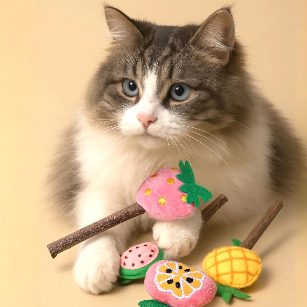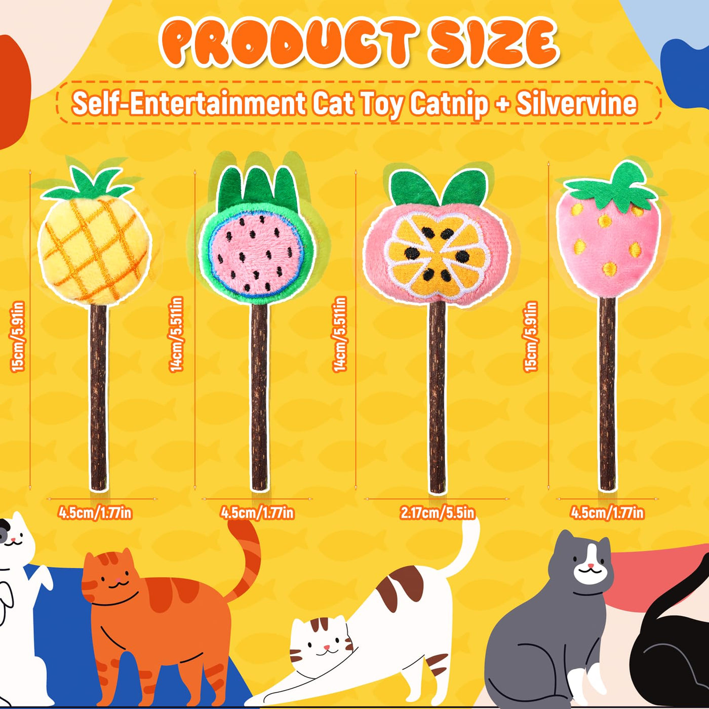 Ptwola 4 Pcs Natural Fruit Silvervine Sticks Cat Kittens Chew Toys Indoor Lollipops Interactive Cat DentalTeething Nip Treat Toy