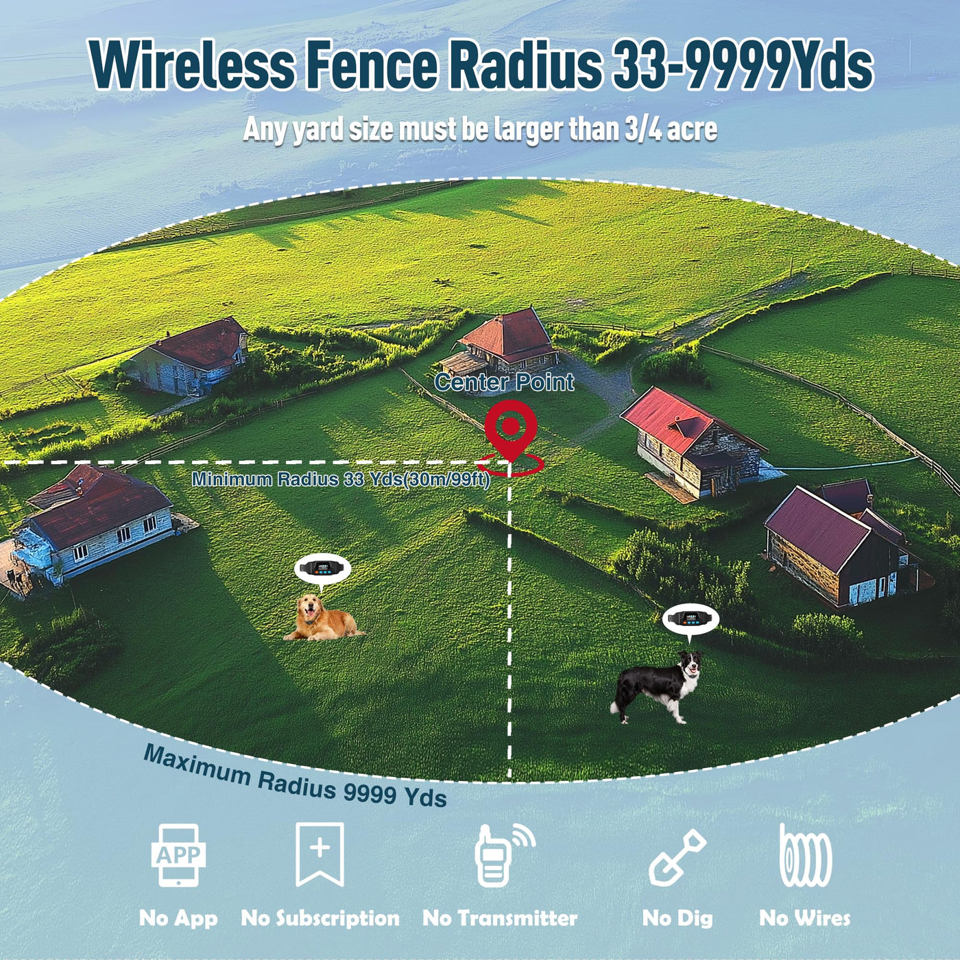 PUPKIDS Wireless Dog Fence for 2 Dogs, Electric Fence for Dogs - Radius Up to 33-9999 Yards Adjustable Training Collar for Large