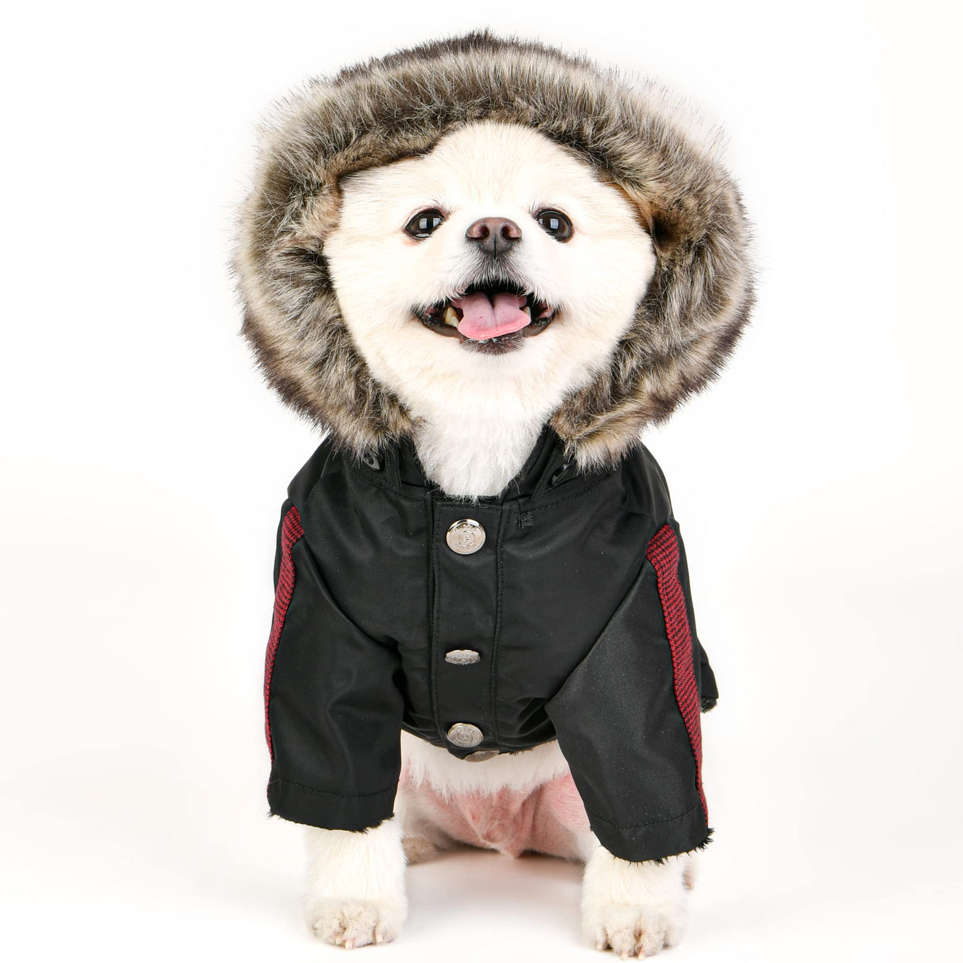 The Brock is a Winter jumper that will surely keep your furry friend warm through the cold season. It features a frontside snap closure and detachable hood with faux fur trimming, with an added Puppia rubber label for looks. It is available in Red and Teal in sizes ranging from Small to Double XL. Please note that because these products were created with small/medium dog breeds in mind, larger sizes (i.e. Large, Extra-Large, etc.) do not necessarily mean larger breeds. Please refer to image of the size chart. It is very important to measure your dog with a tape measure according to the size chart. As a general rule of thumb, if your dog falls in between sizes, it is usually better to go up a size. Any weight figures are for estimates only. Always use actual measurements. Please note that when measuring your dog for clothing, it's very important to have an accurate measurement of your dog's neck and chest girth. IMPORTANT: Please note that when measuring your dog, the measurement for the neck must be taken at the BASE OF THE NECK and chest girth must be taken behind the front legs. Also it is important to take into account the size of the dog's head as well as neck girth and chest girth. Since some dogs have a much larger head than their neck, please be sure that the neck opening is large enough to slide over your dog's head.