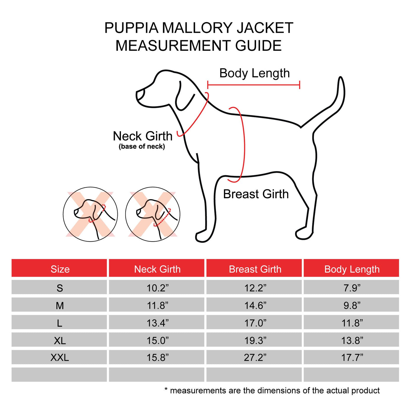 Q: How do I measure my dog for the Puppia Mallory Pet Coat?A: To measure your dog for the Puppia Mallory Pet Coat, use a tape measure to get the neck measurement at the base of the neck and the chest girth behind the front legs. Ensure you account for the size of your dog's head, as the neck opening should be large enough to slide over their head.