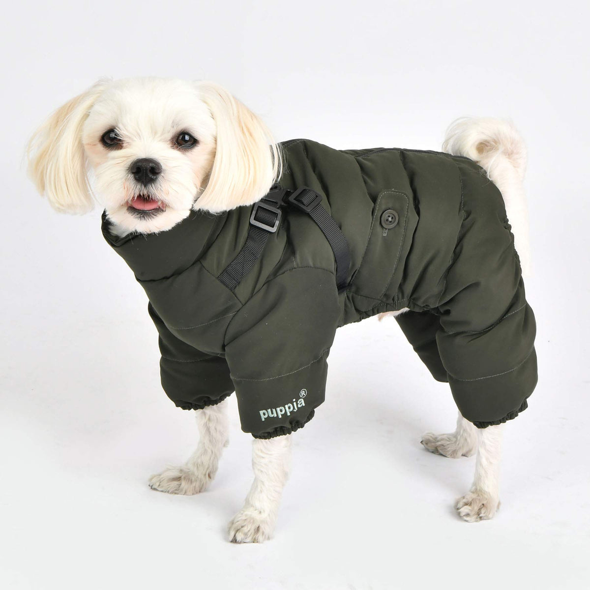 Q: Does the jumpsuit have any special features?A: Yes, the Puppia Soft Onesie features an integrated harness, a backside zipper closure, and a pocketable design with a pouch, making it both functional and convenient for daily use.