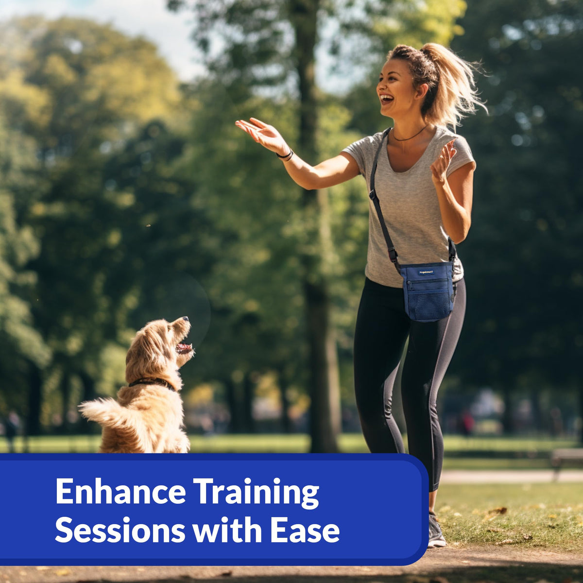 Introducing the PupSensei dog pouch, a practical tool for your dog training kit. This durable dog treat bag is crafted from polyester, designed for long-lasting use. Its versatile design makes it a helpful dog training pouch for treats, making it a valuable partner during your pet training sessions. The PupSensei dog pouch offers a 3-cup storage, allowing you to carry enough treats for extended training sessions or walks. Worried about treat spillage? Our dog treat pouch features a secure, no-spill magnetic closure, preventing any accidental spillage and keeping treats fresh. The treat pouches for pet training also come with a built-in poop bag dispenser for easy access and convenience during walks or training sessions. A roll of poop bags is included with your purchase. Robust and practical, this dog treat bag can be worn in multiple ways thanks to its adjustable strap. Attach it to your waist like a dog treat fanny pack or hang it using the sturdy metal clip. No matter how you choose to wear it, our dog training treat pouch will stay securely in place. One feature of this dog training bag is its ease of cleaning. After a day of training or a long walk, simply wipe it clean. The PupSensei dog treat pouch for training is also useful for puppy training, thanks to its convenient size and easy accessibility. This treat bag for dog training is a helpful addition to any dog trainer treat pouch collection. In conclusion, the PupSensei dog pouch is a convenient tool for pet training. Its durable construction, practical features, and convenience make it a reliable training treat pouch. Whether you're a professional trainer or a pet owner, our dog treat bag will make your pet training sessions easier.