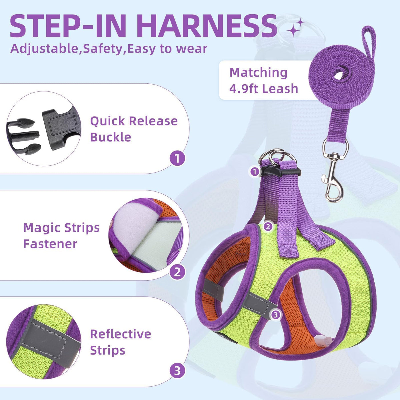 [STEP IN NO PULL NO CHOKE] - The harness is adopted magic strap closure so it's very easy for wearing. Just open the harness let your dog's front legs through the harness then reclose the closure and buckle it up and connect the leash with double D-rings finished! Cushioned design reduces neck friction and the metal D-ring easily links to leash hooks not easy to swing preventing suffocation and pull.