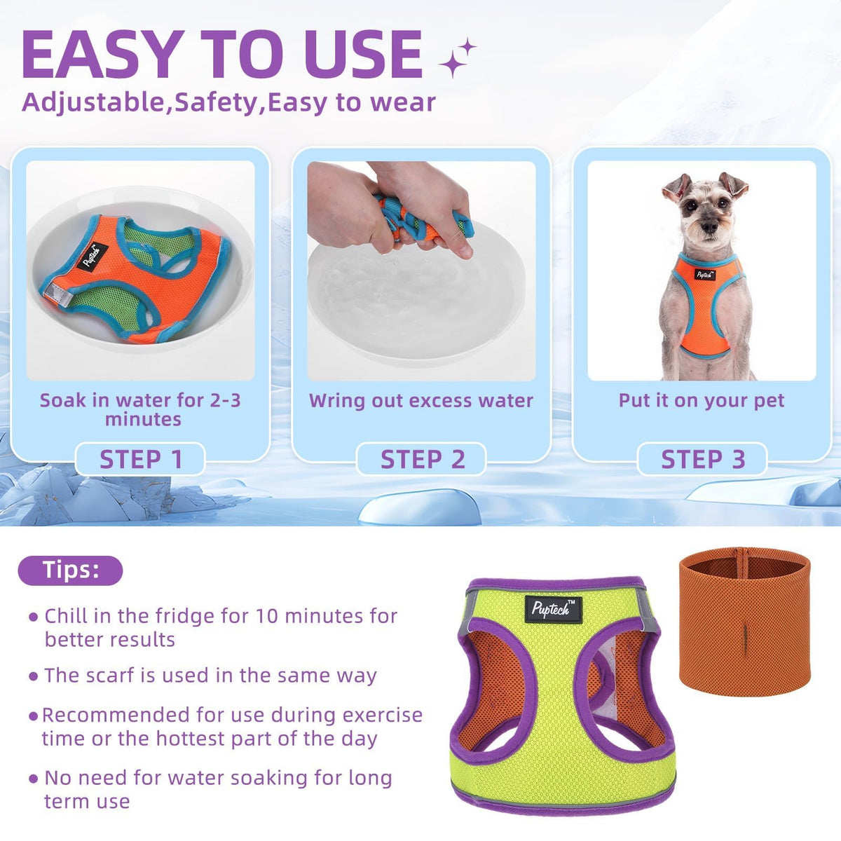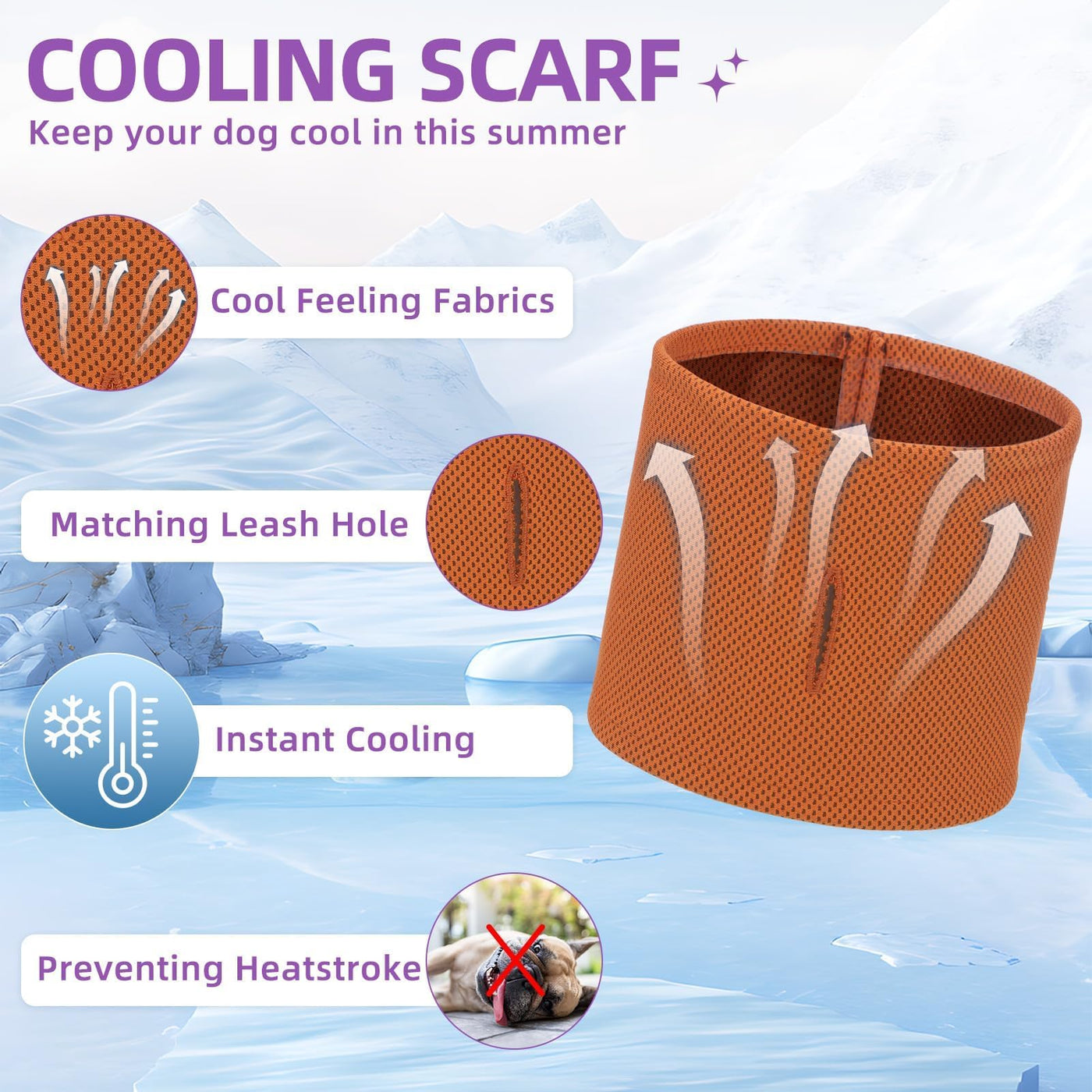 [DOG HARNESS COLLAR & LEASH] - The package includes three items a walking harness a scarf collar and a 4.9ft matching leash. The scarf collar is made of cooling breathable and heat-dissipating fabric the leash is equipped with a 360-degree rotation metal hook and the harness is adopted with a quick-release buckle and double D-rings which are very heavy-duty. You don't need to spend extra time looking through other accessories this is a very cost-effective set.
