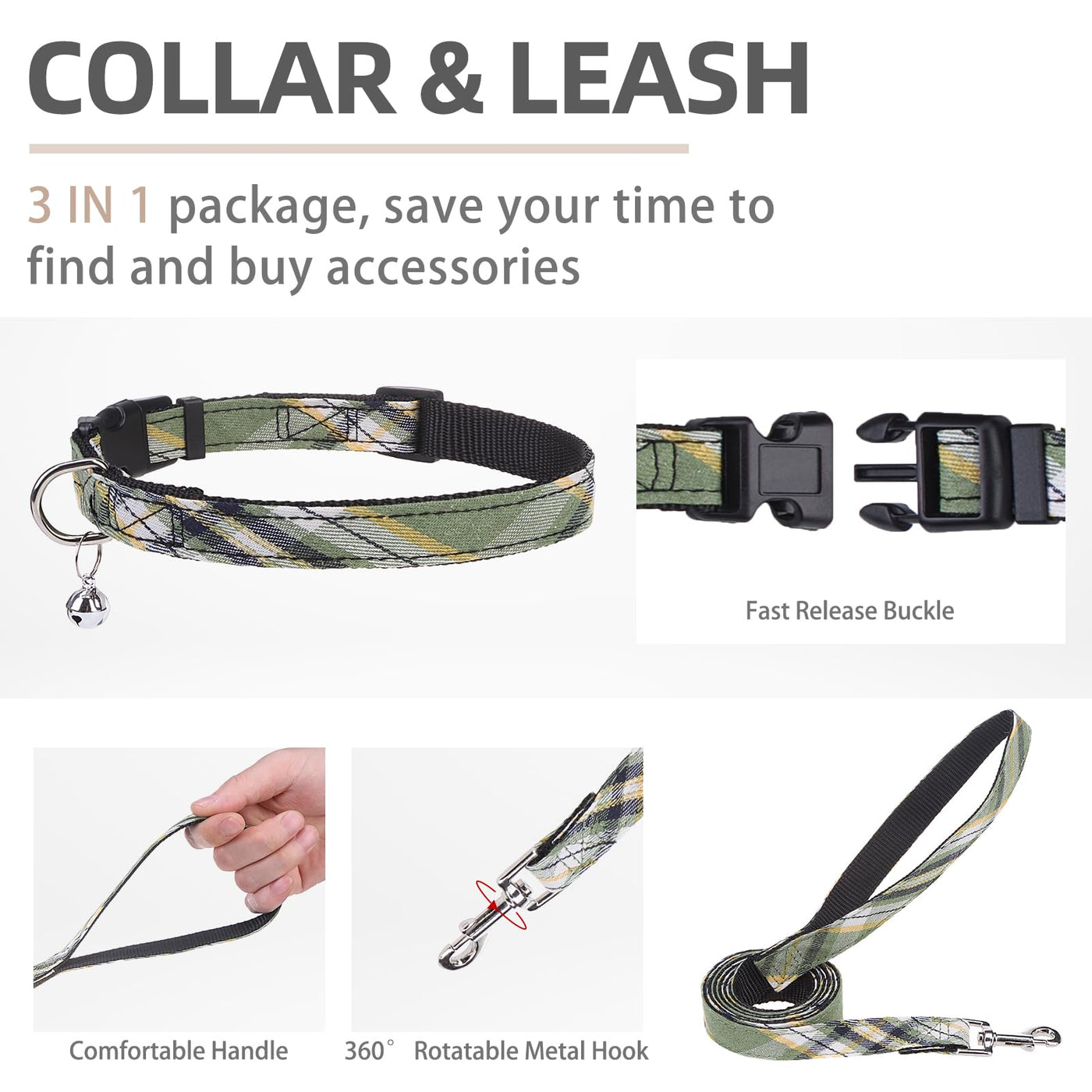 [DOG HARNESS COLLAR & LEASH] - The package includes three items a walking harness a collar and a 4.9ft matching leash. The collar is with bell the leash is equipped with a 360-degree rotation metal hook and the harness is adopted with a quick-release buckle and double D-rings which are very heavy-duty. You don't need to spend extra time looking through other accessories but you get all of these items at the same time with less money! So this is a very cost-effective set.