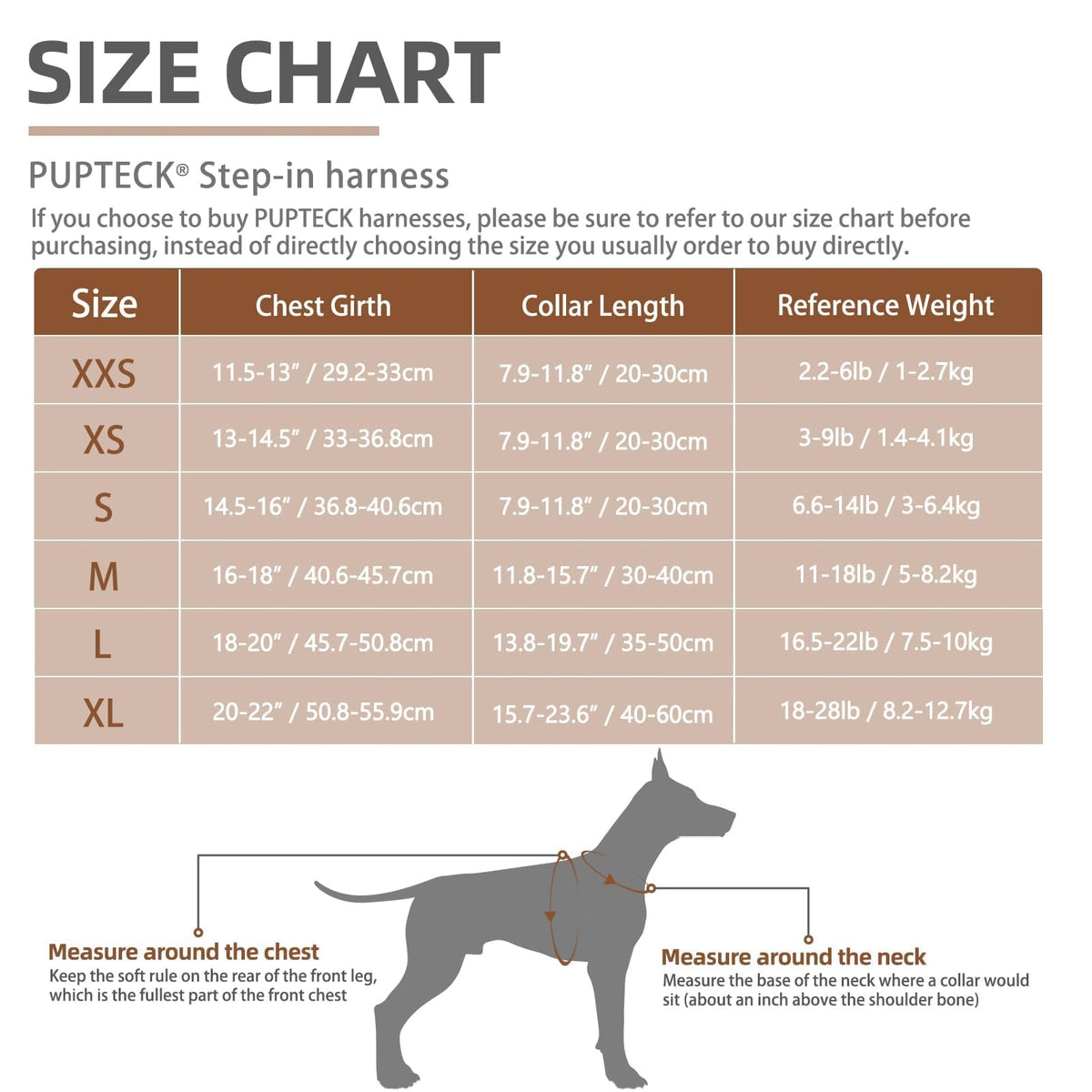 Q: Is the PUPTECK harness suitable for all dog breeds?A: Yes, the PUPTECK harness is designed for small to medium dogs, making it suitable for a variety of breeds. It's important to measure your dog's chest girth and refer to the size chart to find the best fit.