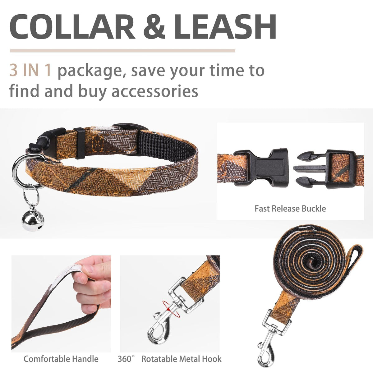 [DOG HARNESS COLLAR & LEASH] - The package includes three items a walking harness a collar and a 4.9ft matching leash. The collar is with bell the leash is equipped with a 360-degree rotation metal hook and the harness is adopted with a quick-release buckle and double D-rings which are very heavy-duty. You don't need to spend extra time looking through other accessories but you get all of these items at the same time with less money! So this is a very cost-effective set.