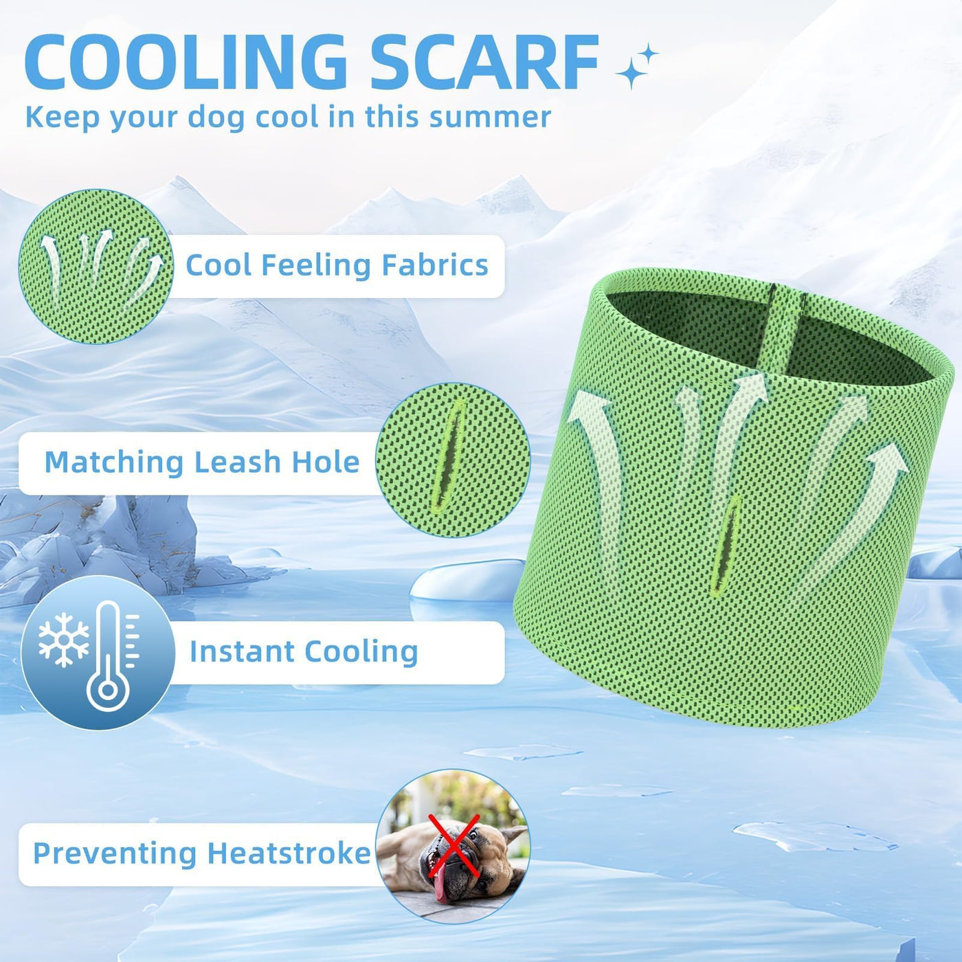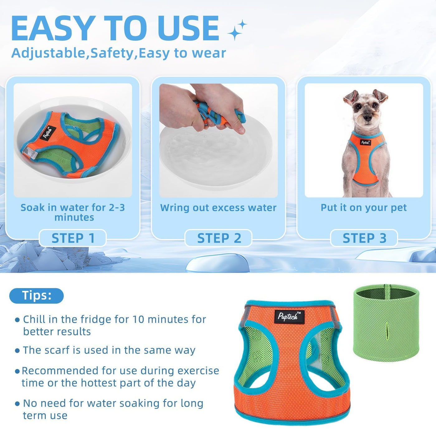 [DOG HARNESS COLLAR & LEASH] - The package includes three items a walking harness a scarf collar and a 4.9ft matching leash. The scarf collar is made of cooling breathable and heat-dissipating fabric the leash is equipped with a 360-degree rotation metal hook and the harness is adopted with a quick-release buckle and double D-rings which are very heavy-duty. You don't need to spend extra time looking through other accessories this is a very cost-effective set.