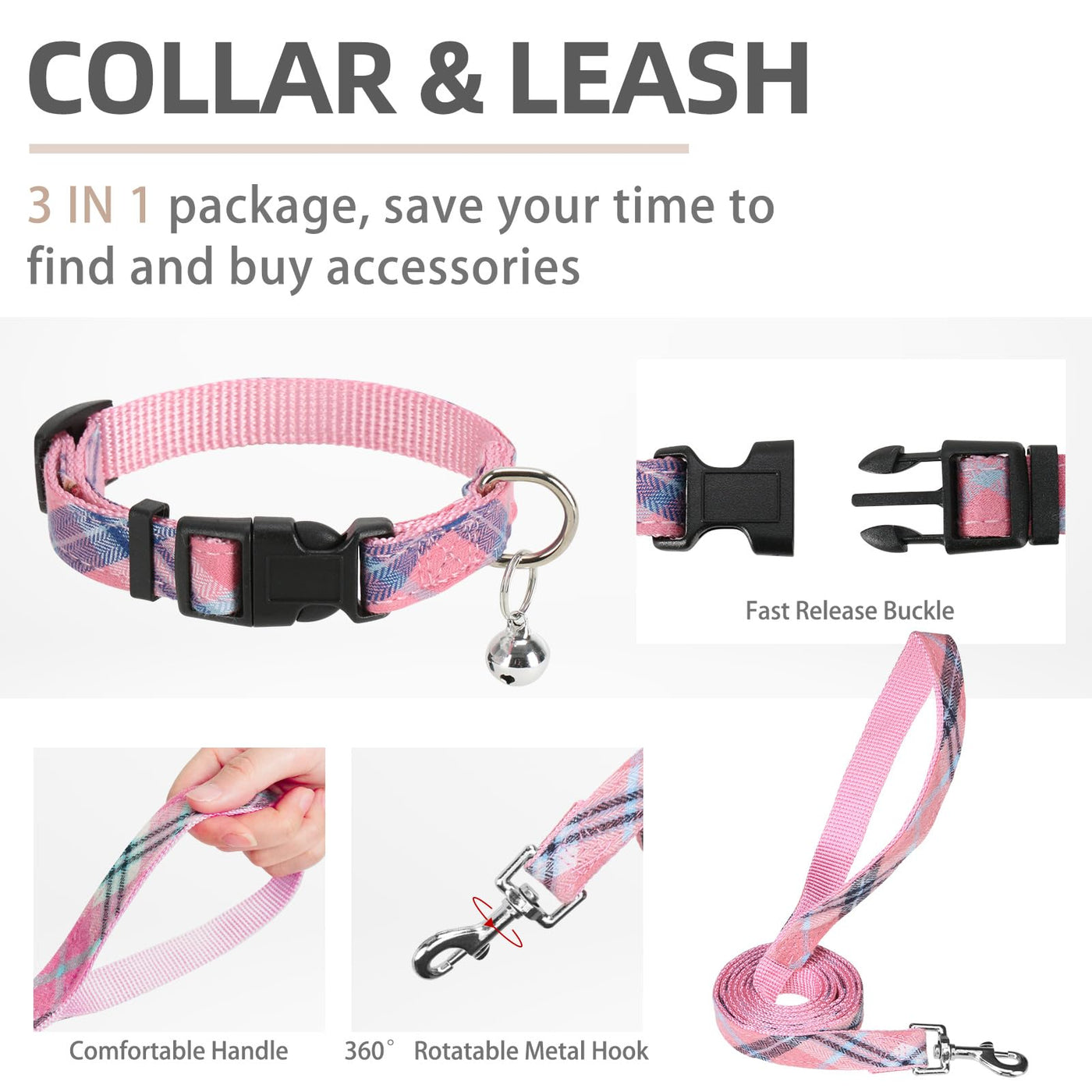 [DOG HARNESS COLLAR & LEASH] - The package includes three items a walking harness a collar and a 4.9ft matching leash. The collar is with bell the leash is equipped with a 360-degree rotation metal hook and the harness is adopted with a quick-release buckle and double D-rings which are very heavy-duty. You don't need to spend extra time looking through other accessories but you get all of these items at the same time with less money! So this is a very cost-effective set.