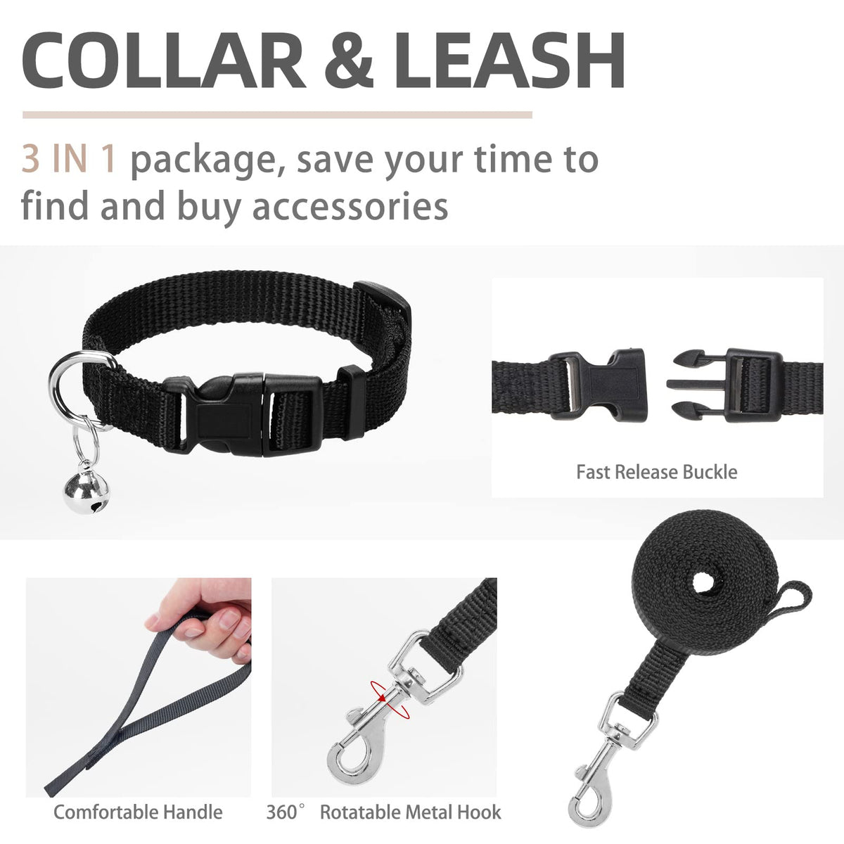 [DOG HARNESS COLLAR & LEASH] - The package includes three items a walking harness a collar and a 4.9ft matching leash. The collar is with bell the leash is equipped with a 360-degree rotation metal hook and the harness is adopted with a quick-release buckle and double D-rings which are very heavy-duty. You don't need to spend extra time looking through other accessories but you get all of these items at the same time with less money! So this is a very cost-effective set.