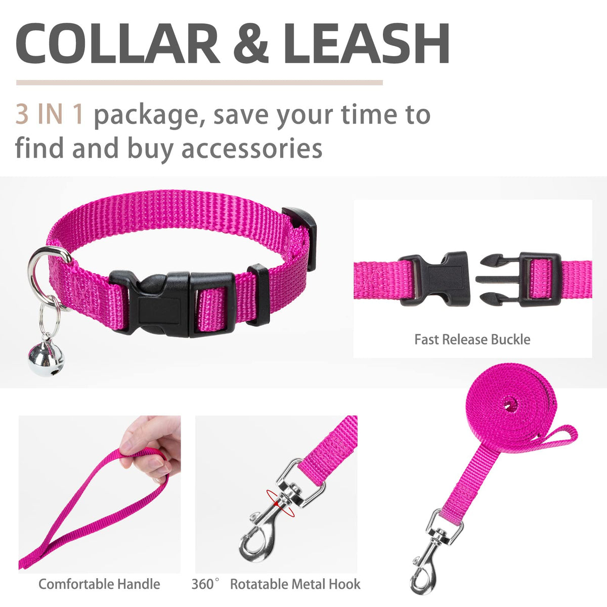 [DOG HARNESS COLLAR & LEASH] - The package includes three items a walking harness a collar and a 4.9ft matching leash. The collar is with bell the leash is equipped with a 360-degree rotation metal hook and the harness is adopted with a quick-release buckle and double D-rings which are very heavy-duty. You don't need to spend extra time looking through other accessories but you get all of these items at the same time with less money! So this is a very cost-effective set.