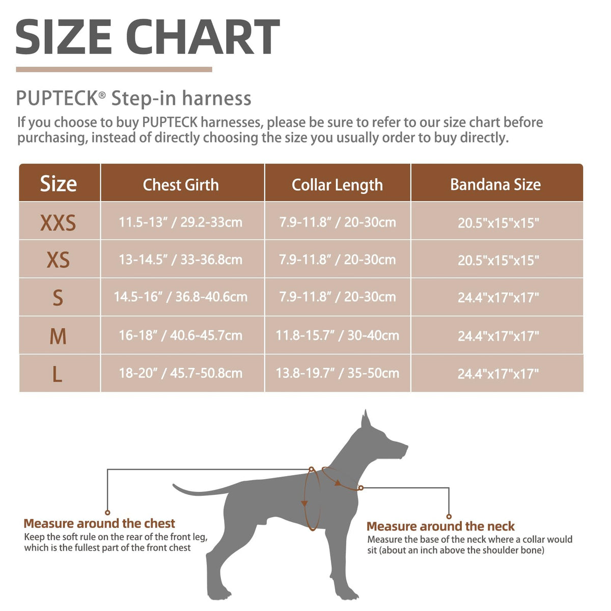 Q: What sizes are available for the PUPTECK Adjustable Dog Harness?A: The PUPTECK Adjustable Dog Harness is available in several sizes: XXS (Chest girth 11.5-13in, Collar 7.9-11.8in), XS, S, M, L, and XL. It’s important to measure your dog and refer to the brand's size chart for the perfect fit.