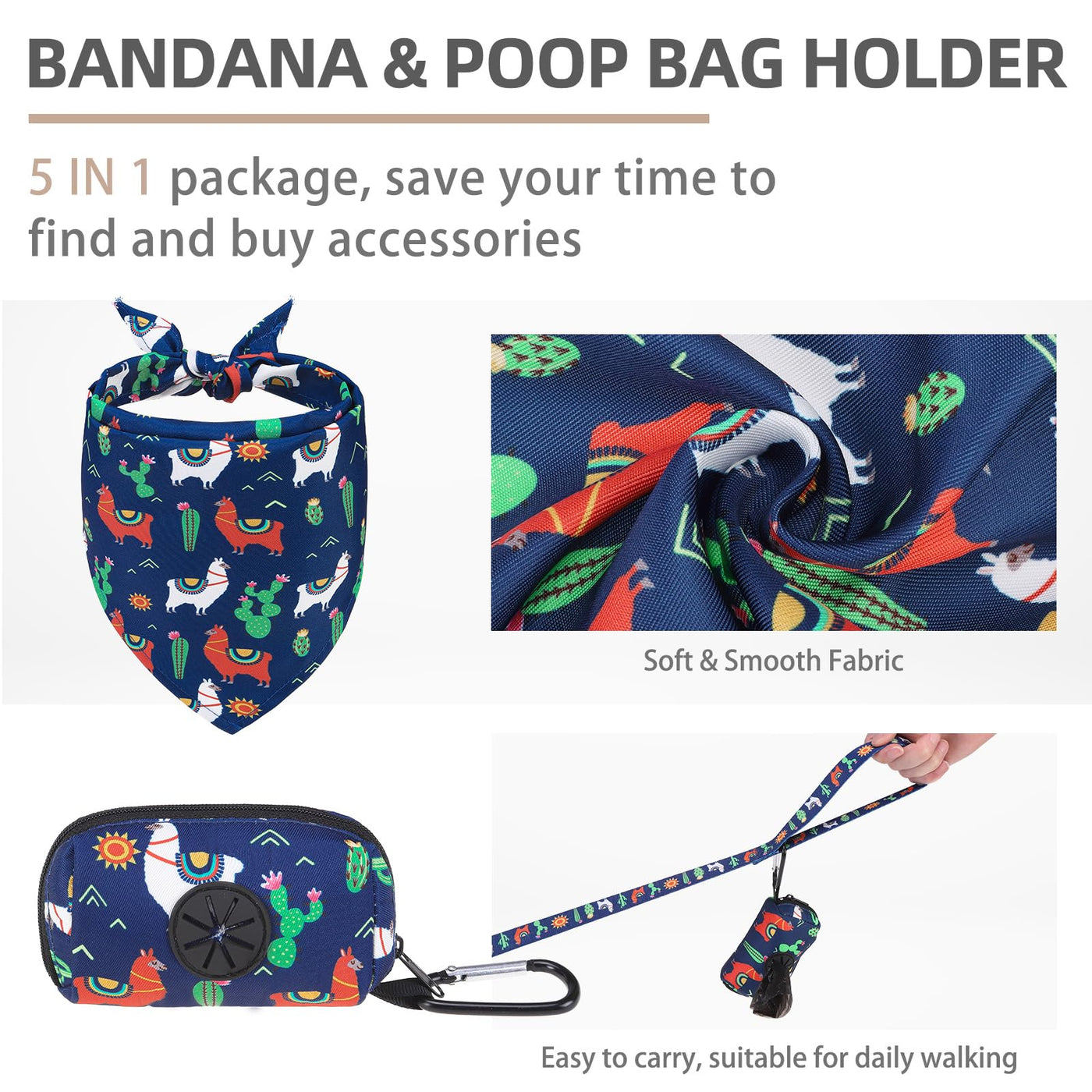 [DOG HARNESS COLLAR & LEASH] - The package includes three items a walking harness a collar and a 4.9ft matching leash. The collar is with bell the leash is equipped with a 360-degree rotation metal hook and the harness is adopted with a quick-release buckle and double D-rings which are very heavy-duty. You don't need to spend extra time looking through other accessories but you get all of these items at the same time with less money! So this is a very cost-effective set.