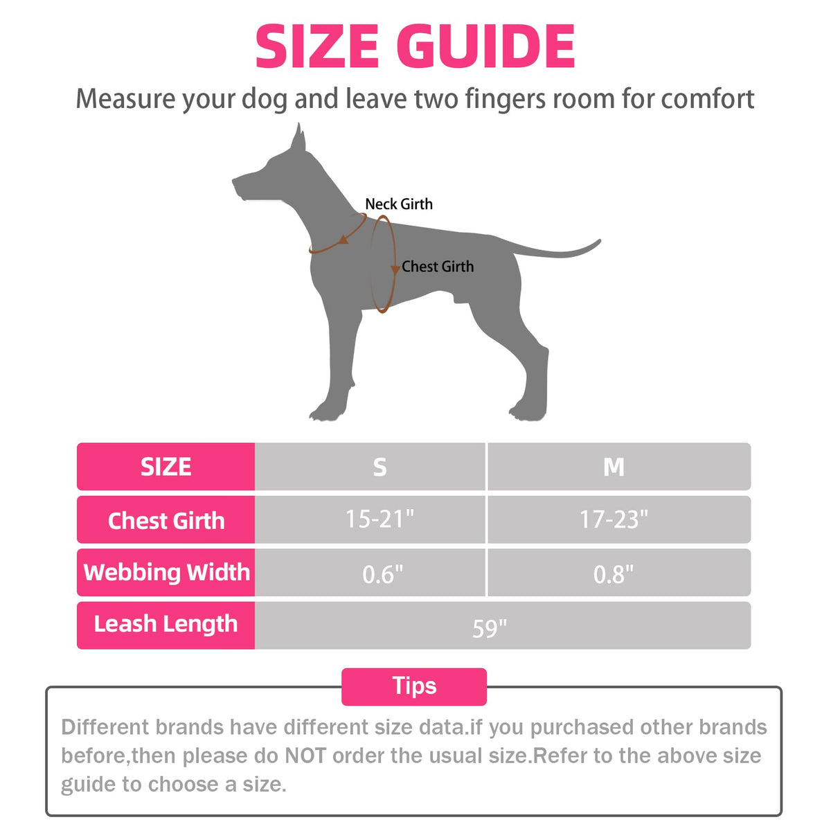 NO PULL - The 2 straps on the neck and chest can distribute the pulling force on the dog allowing you to better control the dog during use and it also makes it less likely for the dog to suffocate STEP-IN - The harness is very easy to put ontake off Just let your dogs front leg in then close the buckle adjust the strap to fit perfectly and done LIgHTWEIgHT - This harness has a simple design there is no need to worry about breathability and it is very light so the dog will not feel burdened wearing it DURABLE - Made of durable polyester this harness wont break easily and will last you a long time with your dog Also if there are quality problems we will take responsibility so if you meet these problems please let us know first SIZE - S(chest girth 15A-21A webbing width 06A) M(chest girth 17A-23A webbing width 08A) Leash Length 59A Please measure your dogs chest girth before purchasing
